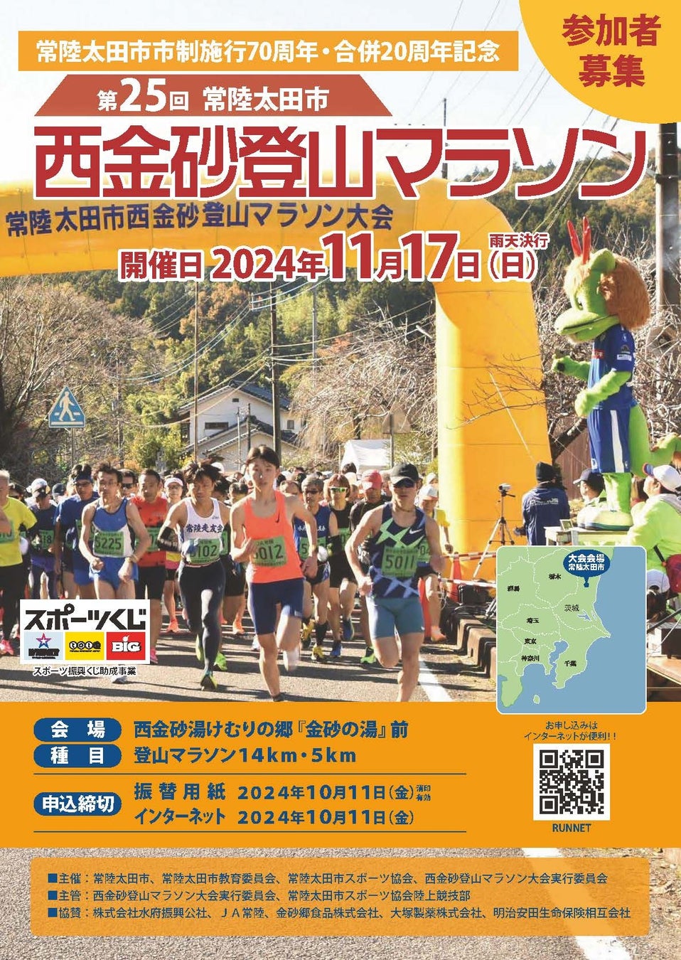 茨城県常陸太田市では、11月17日(日)に市制施行70周年・合併20周年記念「第25回常陸太田市西金砂登山マラソン大会」を開催します。皆さんのご参加お待ちしています。