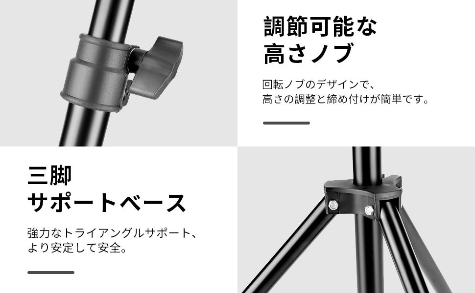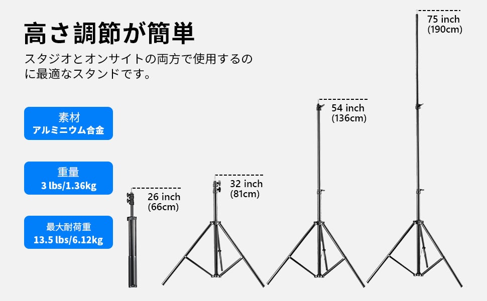 高さ調整・折り畳み可能で、携帯に便利です。リフレクター、ソフトボックス、ライト、背景布など主な撮影アクセサリにも適用。