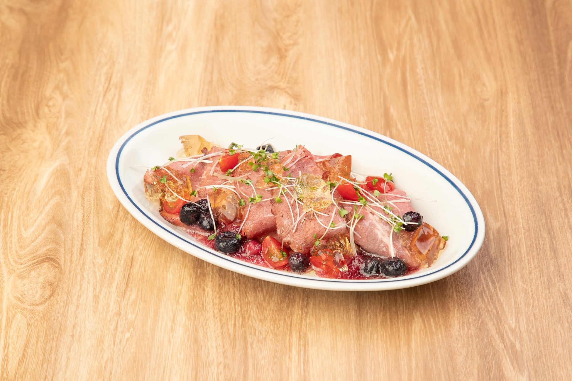 きびオリゴのほんのりした甘さを活かしたジュレ で、ローストビーフをカルパッチョに仕立てました。ベリーの酸味も加わり見た目以上に さっぱりと爽やかにお召し上がりいただけます。