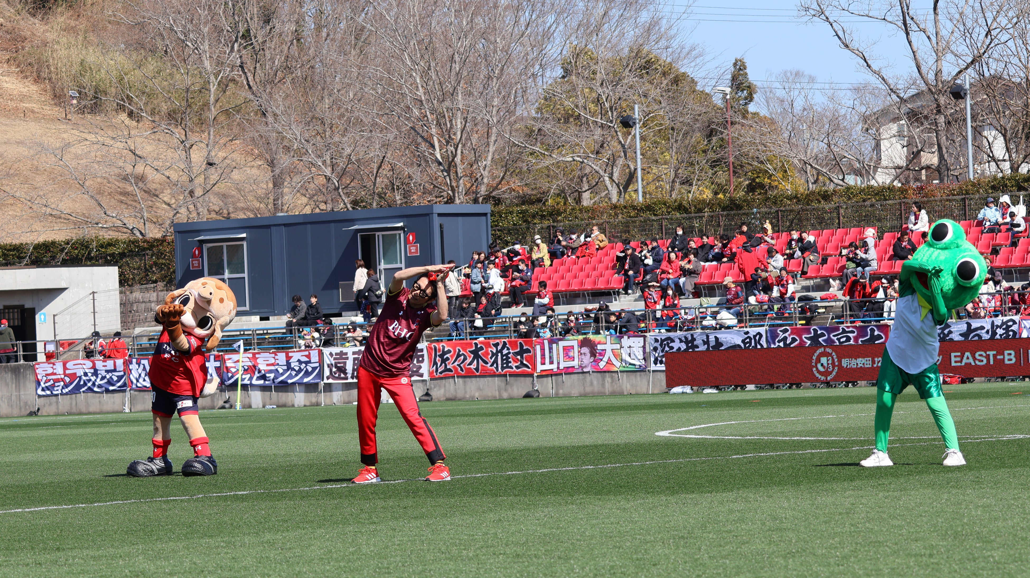 いわきFCホームゲームで 健康ぼうさい体操「ケロロワット体操」を実施