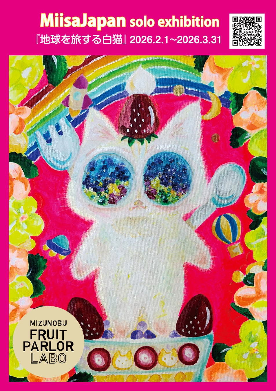 水信フルーツパーラ―ラボにて2月1日(日)~3月31日(火)まで(一社)笑顔プラス子供支援代表MiisaJapanの初個展を開催いたします。売上げは子供支援及び保護猫活動費に充てられます。