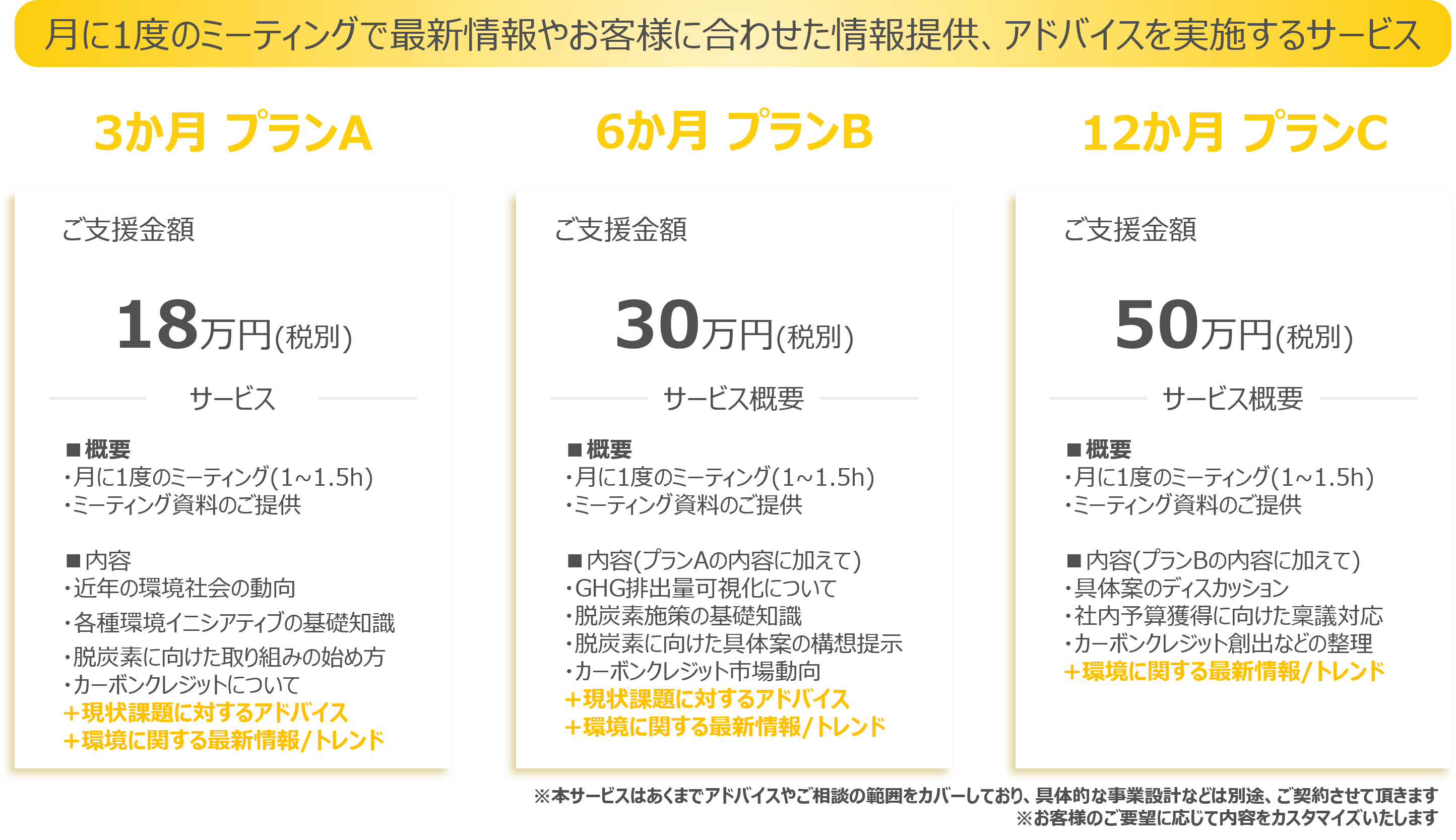 また、実際に脱炭素の施策を事業化及び実施に関しては別途、ご相談のうえでご契約させて頂ければと思います。