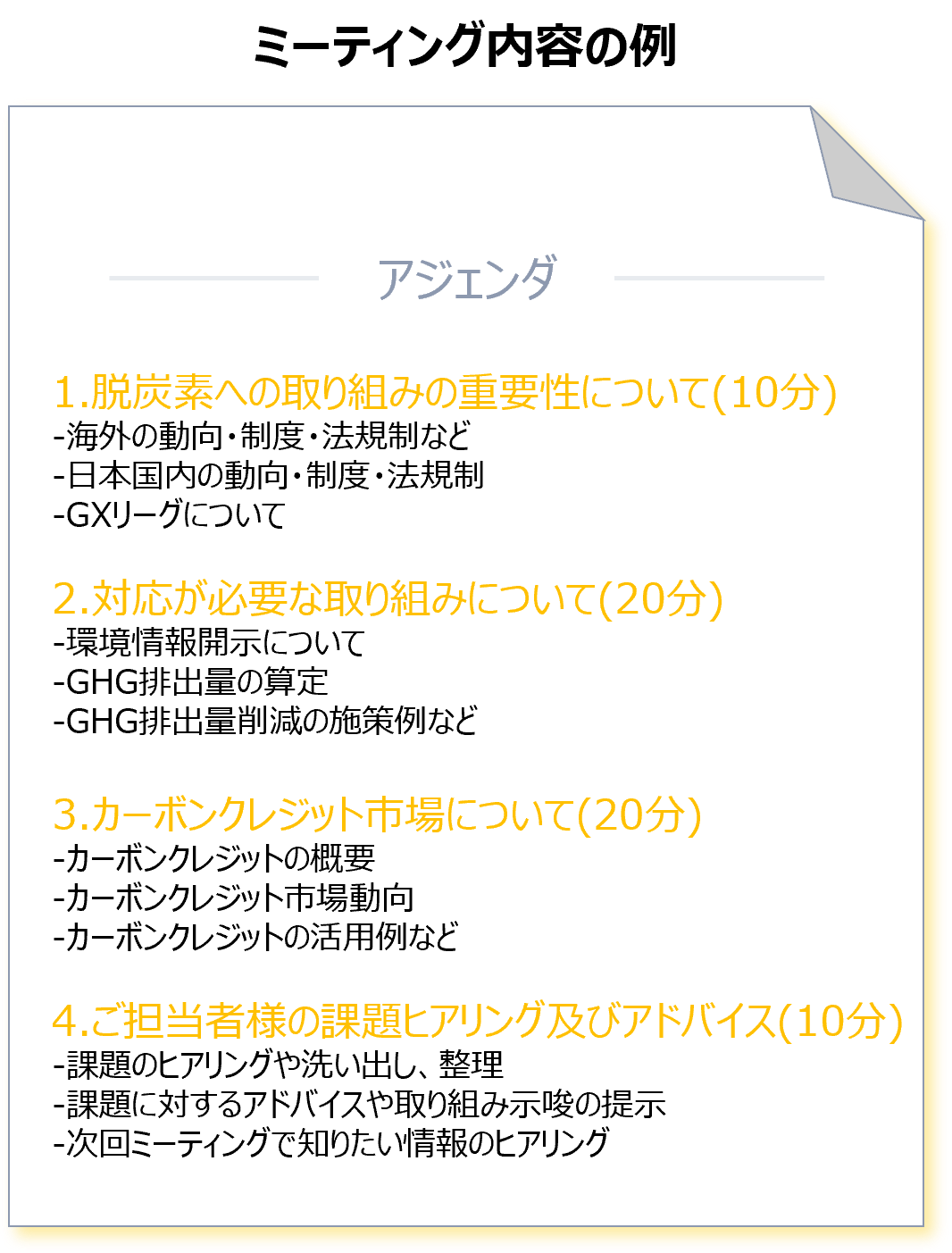 基本的には月に一度のミーティング(1時間~1時間半)をベースに環境に関する基礎知識やトレンドを交えながら企業のご担当者様のご相談に乗ります。ミーティングでは弊社のGX総合研究所事業で各企業の取り組みや環境トレンド、カーボンクレジット市場動向、生物多様性など様々な分野を研究している担当者が
