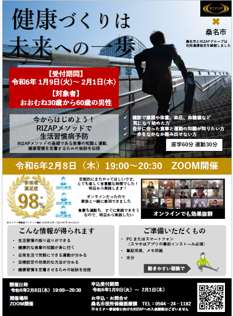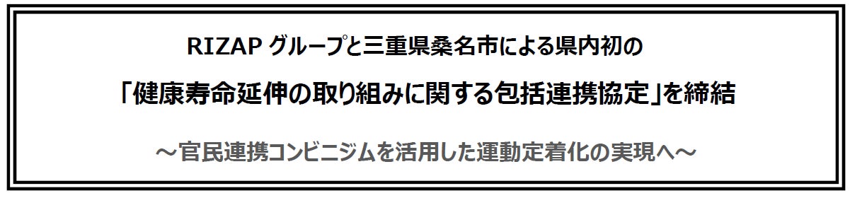 RIZAPグループは三重県桑名市との包括的な連携のもと、市民の健康づくりの分野で相互に協力することで健康寿命の延伸を推進し、社会に必要とされる企業になることを目指してまいります。