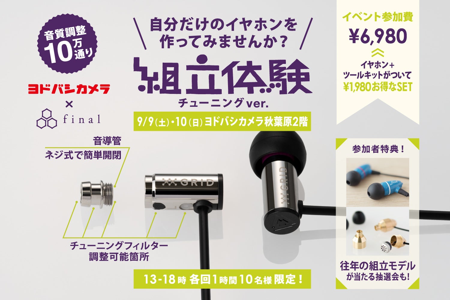 国内オーディオメーカー株式会社final(代表:細尾 満)は、「イヤホン組立体験会 チューニング ver.」を2023年9月9日(土)・10日(日)の2日間限定でヨドバシAkiba店で開催いたします。