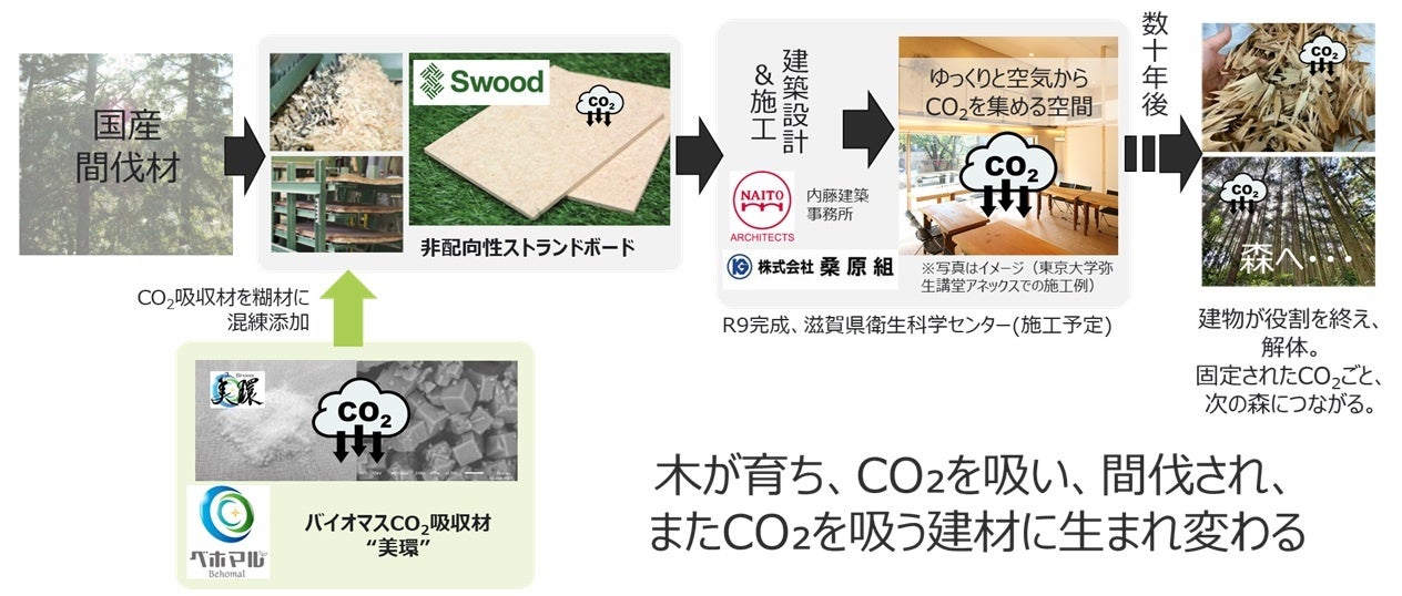 株式会社ベホマル(所在地:滋賀県草津市、代表取締役:西原麻友子)は、株式会社エスウッド(岐阜県)、株式会社桑原組(滋賀県)、株式会社内藤建築事務所(京都府)と4社共同で、CO₂を吸収・固定する新しい国産木質建材『DACストランドボード』を商品化しました。