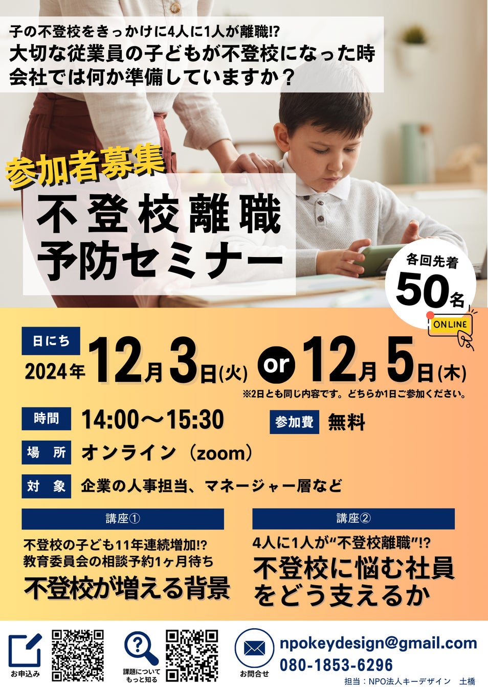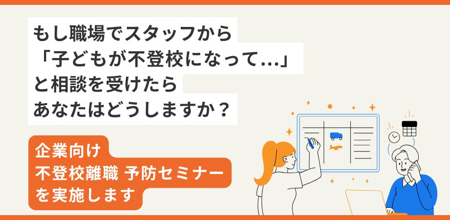 【全国初】”不登校離職”予防セミナーを実施します。子どもの不登校をきっかけに離職する保護者は5人に1人。企業とともに「不登校」という社会課題解決に取り組むきっかけに。