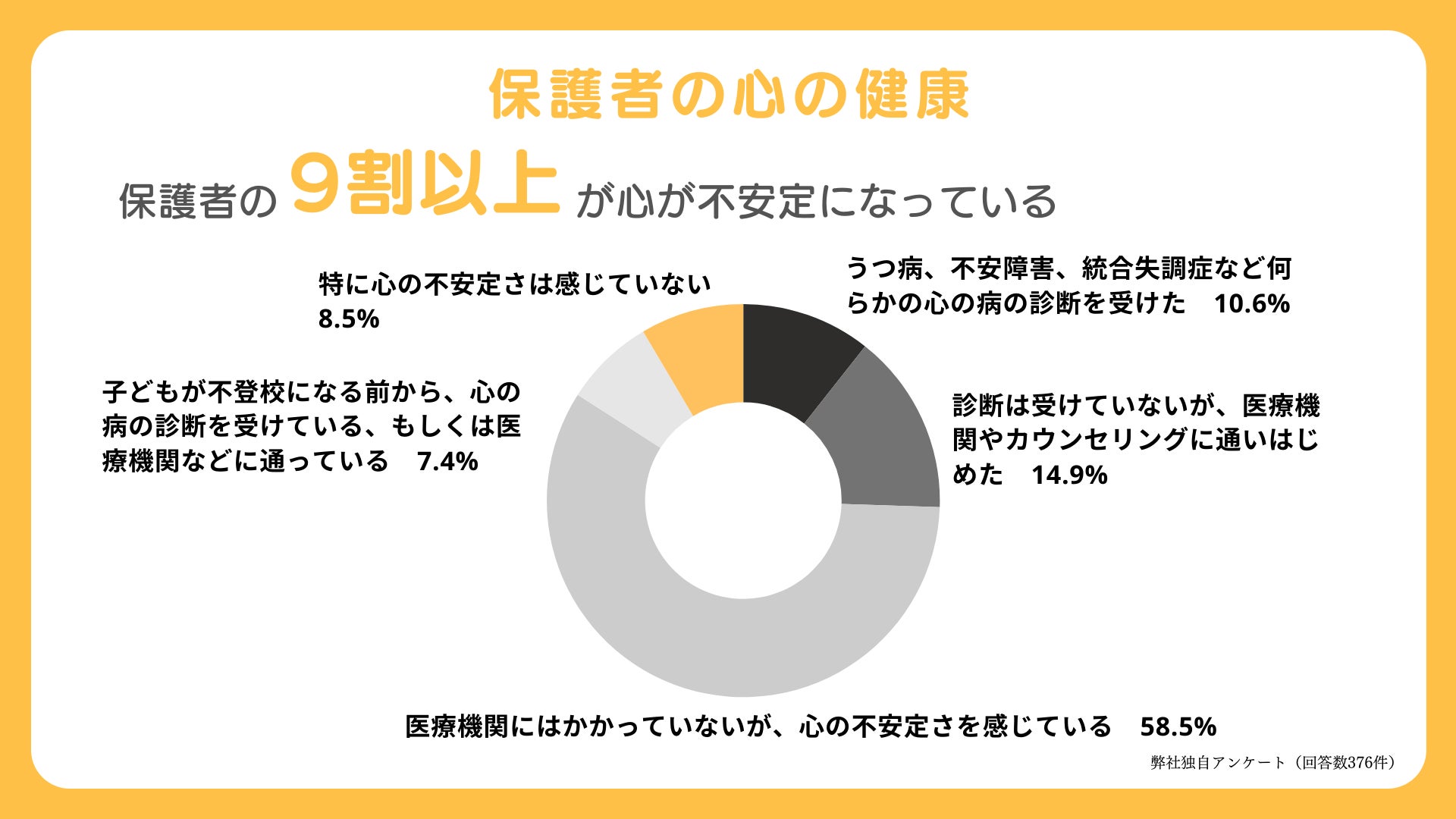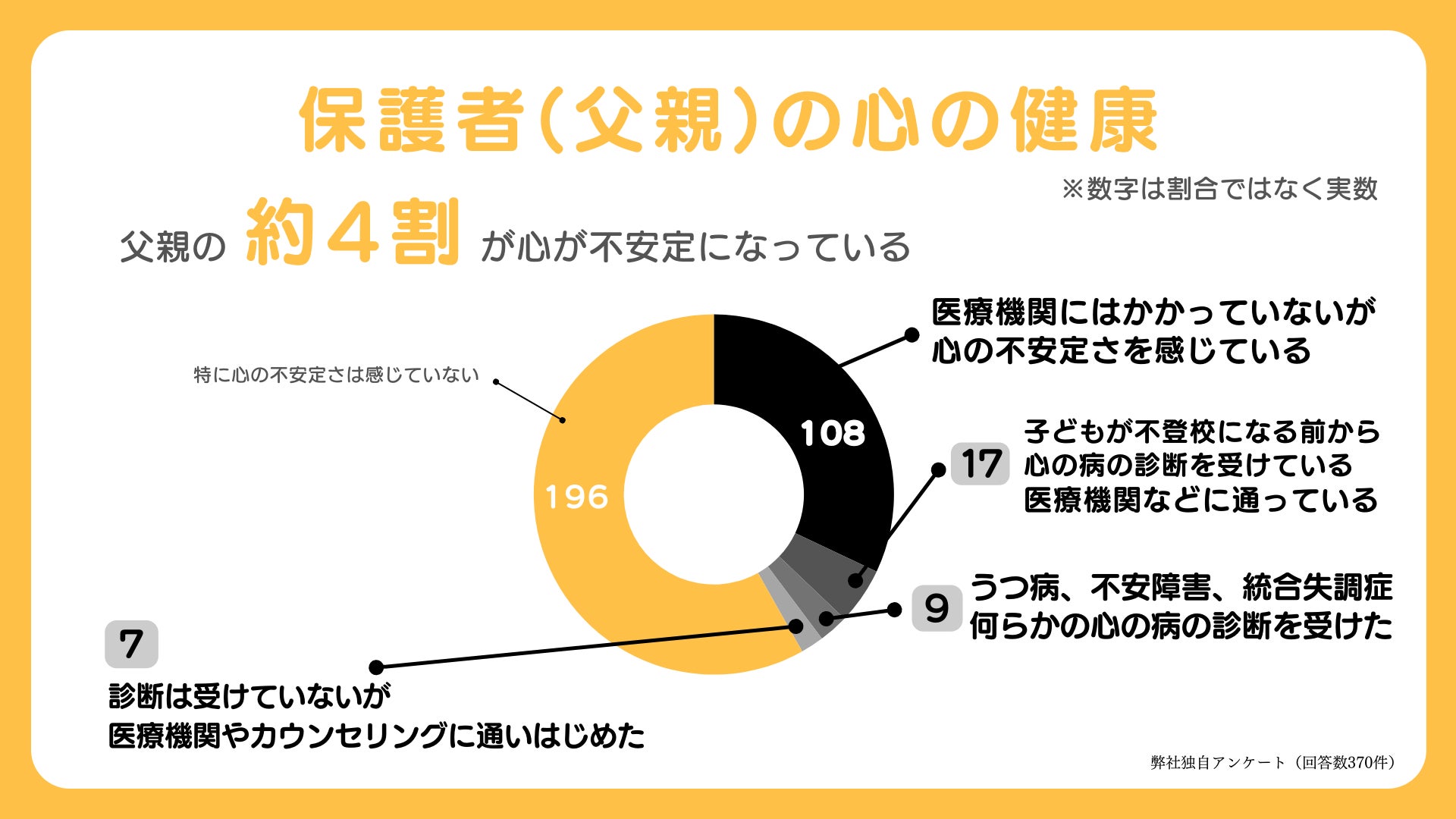 2024年2月に「お母さんのほけんしつ」に登録する保護者向けにとったアンケートによると、子どもの不登校によって離職(休職、退職)する保護者は5人に1人、心の不安定さを感じている保護者は9割にのぼった。こうした場合、よく母親にのみ焦点があたりがちだが、父親に関しても例外ではない。約4割の父親が心が不安定になっていることがわかった。