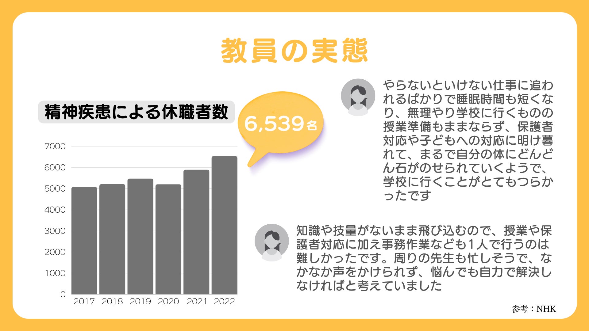 一方で学校の中に焦点を当ててみると「教員の働き方」という課題も見えてくる。実は精神的なことを理由に休職をした教員が過去最多となっている。教員にも余裕がなく、子どもたち一人ひとりに目を向けられなくなっている現状がある。