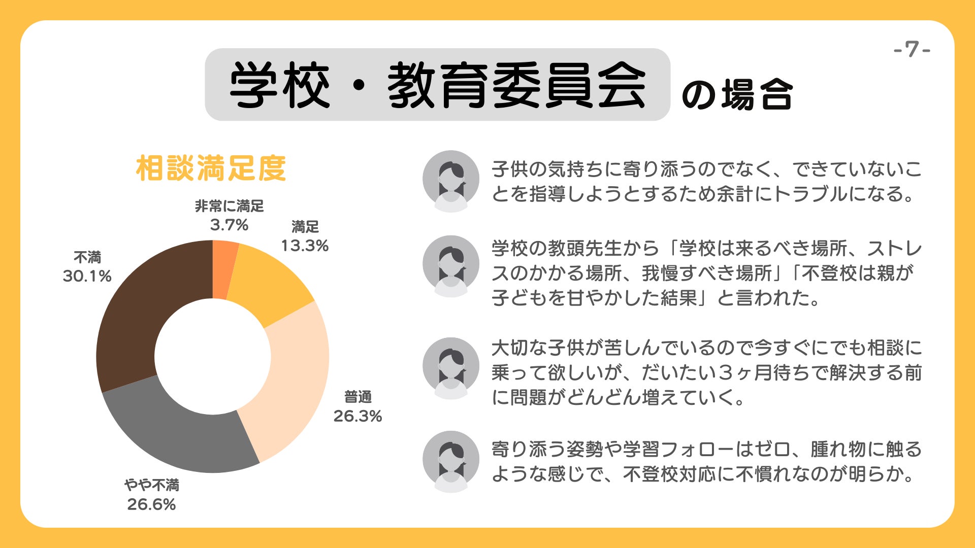 不登校を「親の子育てが悪い」と親の責任にする発言や、学校復帰のみを正解と考える教員・学校がまだ多く存在し、それに対して不安や恐怖を感じてしまう親子が多くいる。ある母親からは「毎朝、学校に欠席の連絡をするのですが、最近は電話を持つ手が震えてしまいます。朝が怖くて、夜も眠れなくなってきました。」そんな声が届いた。