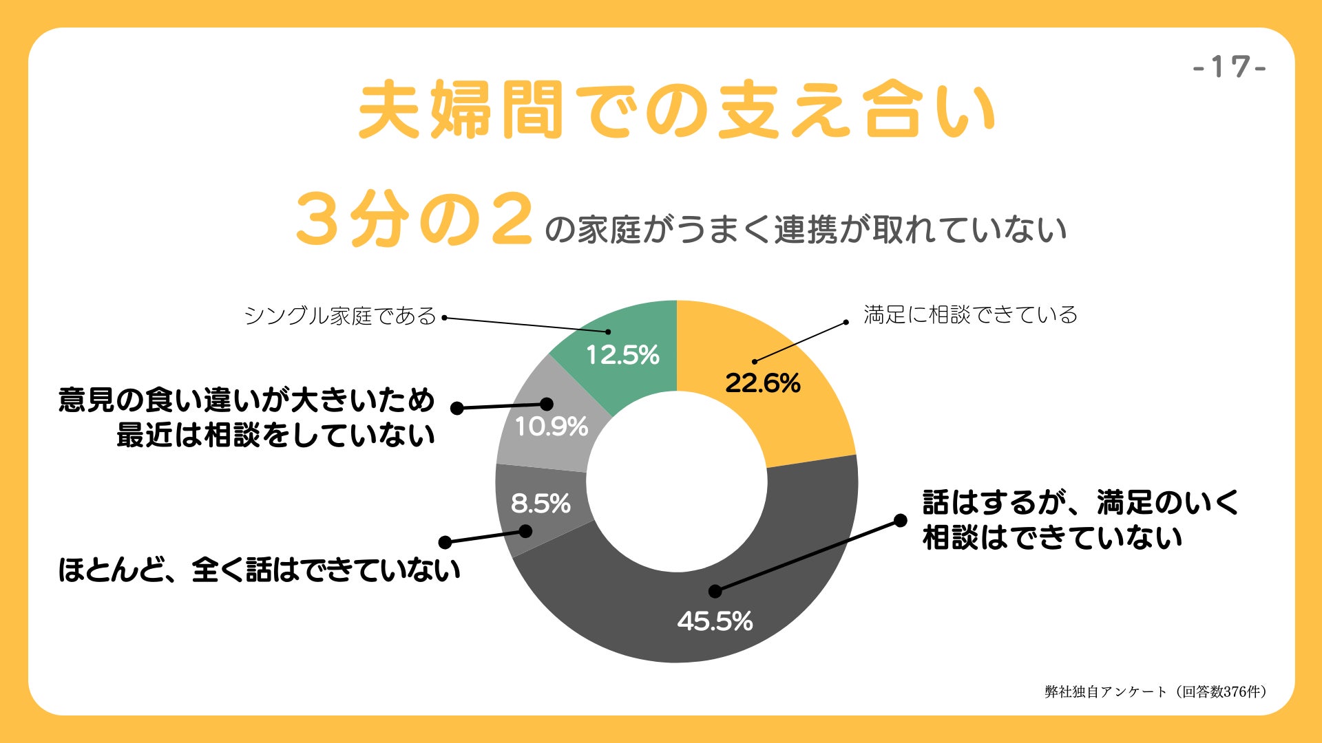 夫婦間での連携について質問してみると、「満足に相談できている」と答えたのは22.6%にとどまり、「話はするが、満足のいく相談はできていない」45.5%、「意見の食い違いが大きいため、最近は相談をしていない」10.9%、「ほとんど、全く話はできていない」8.5%と、3組中2組の家庭がうまく連携できていないことがわかった。