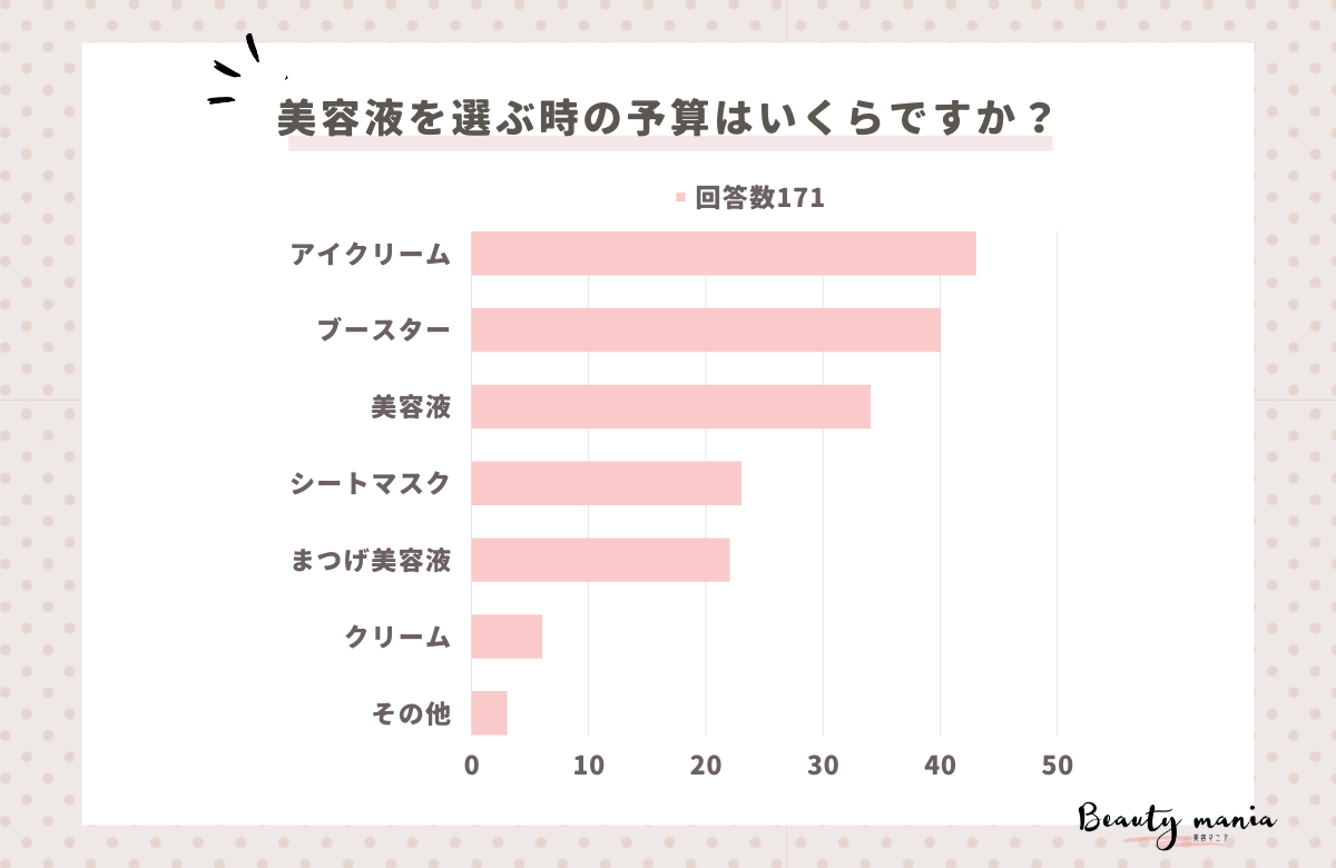 「 スキンケア商品で「今使っていないけどプラスケアしたいアイテム」はなんですか?」とアンケート調査した結果、1位は『アイクリーム(43人)』、2位は『ブースター(導入化粧水や導入美容液)(40人)』、3位は『美容液(34人)』となっています。