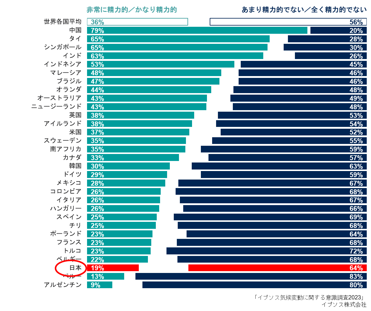 「政府は気候変動対策にどの程度精力的に取り組んでいると思いますか?」という設問に、「非常に精力的」「かなり精力的」と答えた日本人は、19%。31カ国中3番目に低い数字で、世界各国平均(36%)を大きく下回っています。