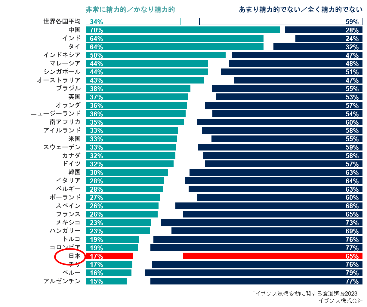 「国民は気候変動対策にどの程度精力的に貢献していると思いますか?」という設問に、「非常に精力的」「かなり精力的」と答えた日本人は、17%。31カ国中3番目に低い数字で、世界各国平均(34%)の1/2です。