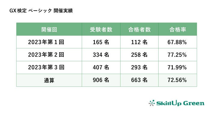 GX(Green Transformation)推進に欠かせない体系的な基礎知識を証明するGX検定を運営する株式会社スキルアップNeXt(以下スキルアップNext、東京都千代田区神田三崎町3丁目3-20、代表取締役 田原 眞一)は、2023年12月4日(月)~ 2023年12月24日(日)に開催した「2023年第3回GX検定 ベーシック」の合格者を発表しました。407名が受験し293名が合格、合格率は71.99%となりました。2023年第1回試験からの通算の受験者数は906名、合格者数は663名となりました。「GX検定 ベーシック」は環境省脱炭素アドバイザー資格の認定を受けているため、合格者は「環境省認定制度脱炭素アドバイザー ベーシック」を名乗ることができます。