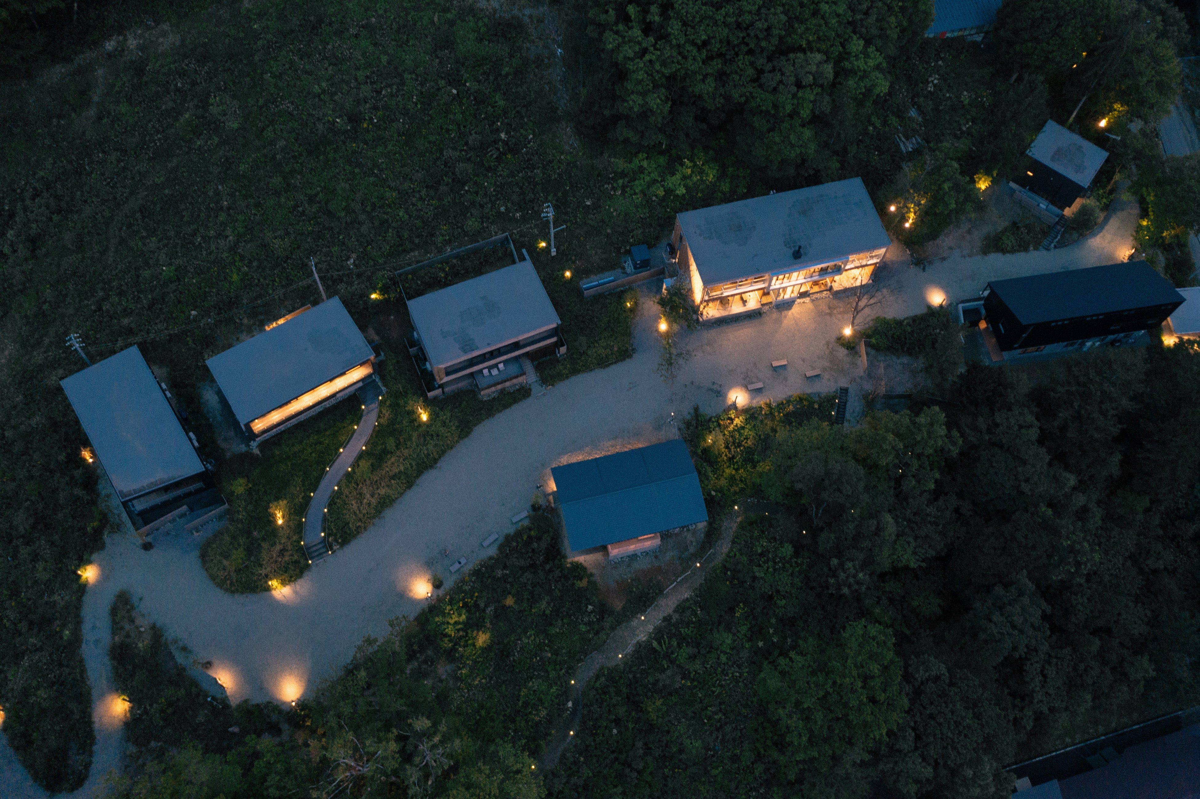 『暮らすように泊まる』をテーマとするヴィラ5棟をはじめ、地域の食や文化を発信する商業棟・ショップ、書道家のギャラリー、訪問者が思い思いに過ごせる東屋・デッキがあり、全ての建築に道産カラマツ・ナラ・タモ・道南スギなど、北海道で育った木材をふんだんに使用しています。