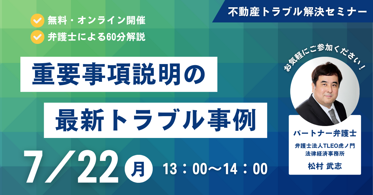 「『重要事項説明の最新トラブル事例』徹底解説セミナー」を無料・オンラインにて開催いたします。