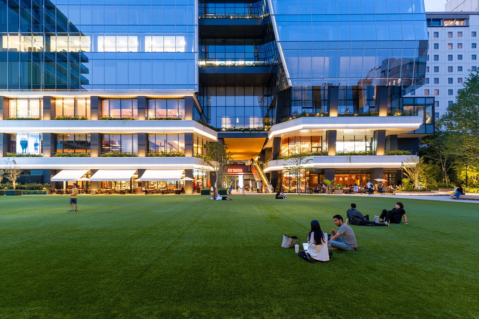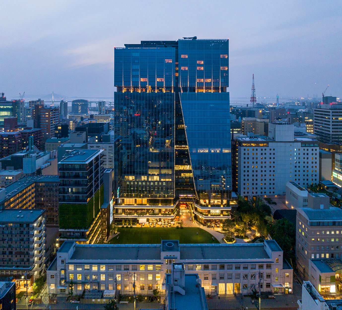 福岡市が主導する都市機能更新施策「天神ビッグバン」により、福岡は新しいステージへと進みつつあります。福岡大名ガーデンシティは、航空法の高さ制限の緩和によって、周囲から際立つ高さを獲得しました。ホテルやオフィスなど多彩な用途を一つのガラスの塊(インゴット)として統合するとともに、それらをライトアップの光によって演出することで、都市の新たなアイコンとして表現しています。低層部は、かつての小学校のグラウンドを、囲い込まれた都市の中庭として再生し、緩やかな温かい光で包み込みました。夕刻から夜間にかけて、安心感のある空間が形成され、多様な人々が集まる居場所となっています。