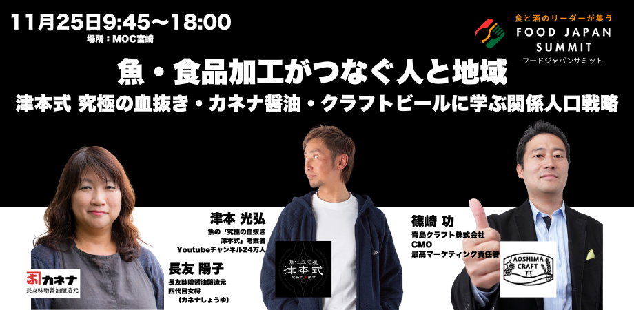 登壇:津本 光弘(津本式究極の神経絞め考案者/長谷川水産)、長友 陽子(カネナ醤油)、篠崎 功(青島クラフト)