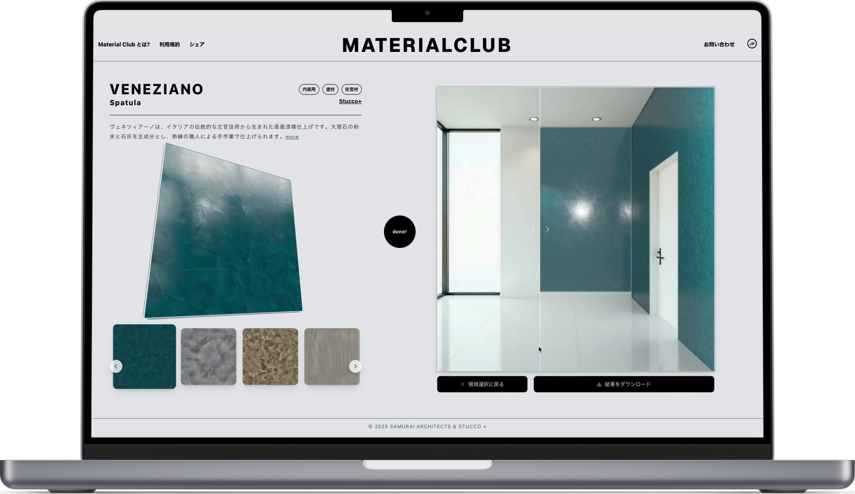 私たちスタッコは、イタリア漆喰を中心とした左官仕上げを国内外で手がけ、これまでに累計100万平米を超える空間を施工してきました。その中で常に感じてきたのは、建築意匠の「最終決定」の難しさです。設計者やお施主様のこだわりを丁寧に共有しながらも、実物サンプルだけでは光の反射や素材のスケール感といった“空間的な質感”を正確に伝えることが極めて難しい——それが長年の実感でした。今回、SAMURAI ARCHITECTSと共同で開発した MATERIAL CLUBは、その課題を根本から解決する可能性を持っています。