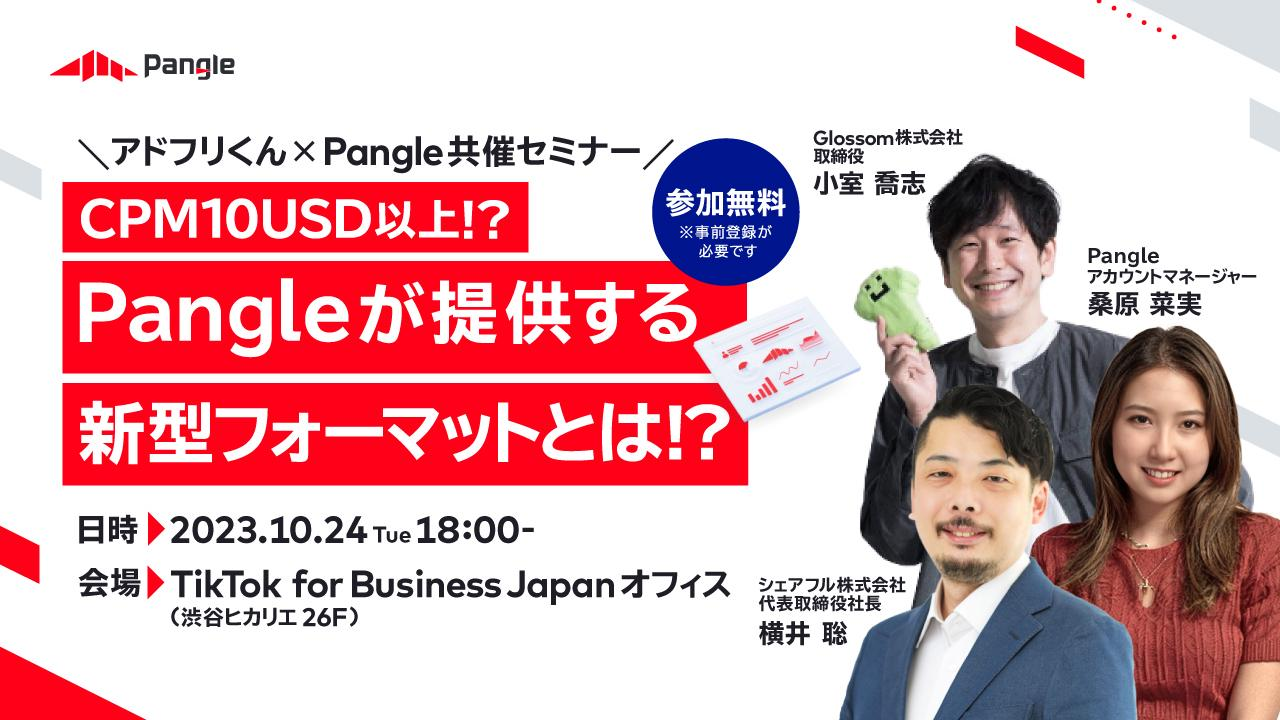10月24日(火)18時からTikTok for Business Japan オフィス (渋谷ヒカリエオフィス) にて、広告収益を最大化するツール(SSP)アドフリくんを運営するGlossom株式会社とPangleが共同セミナーを開催します。