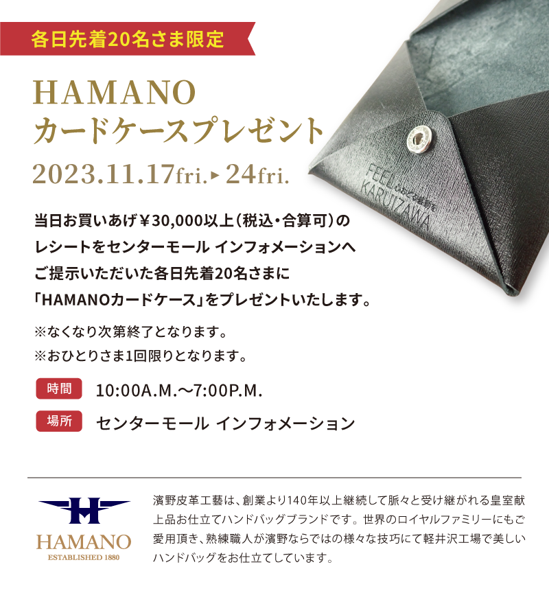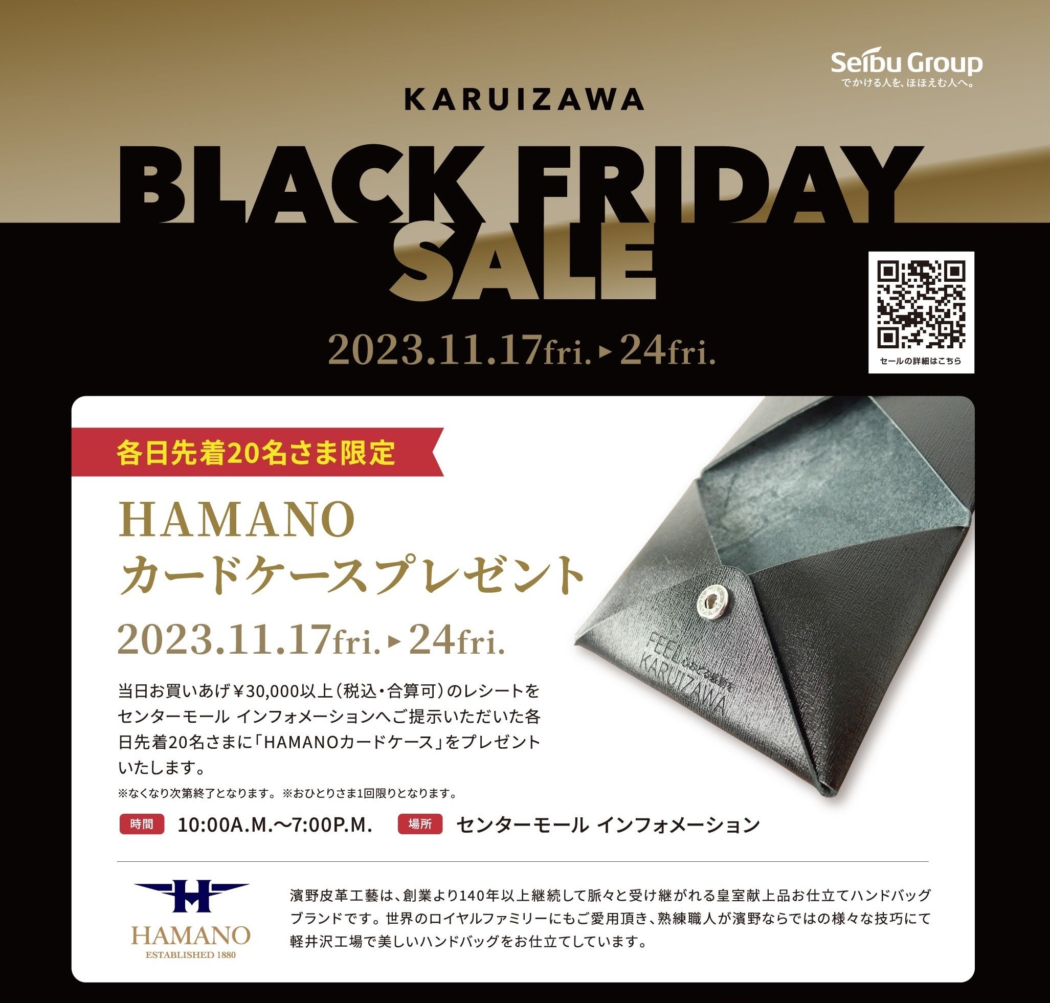 2023.11.17(金)~11.24(金)の期間、KARUIZAWA PRINCE SHOPPING PLAZAのイベント『 BLACK FRIDAY SALE 』で30,000円以上(税込・合算可)レシートをご提示いただいた各日先着20名さまに『HAMANOカードケース』プレゼント。