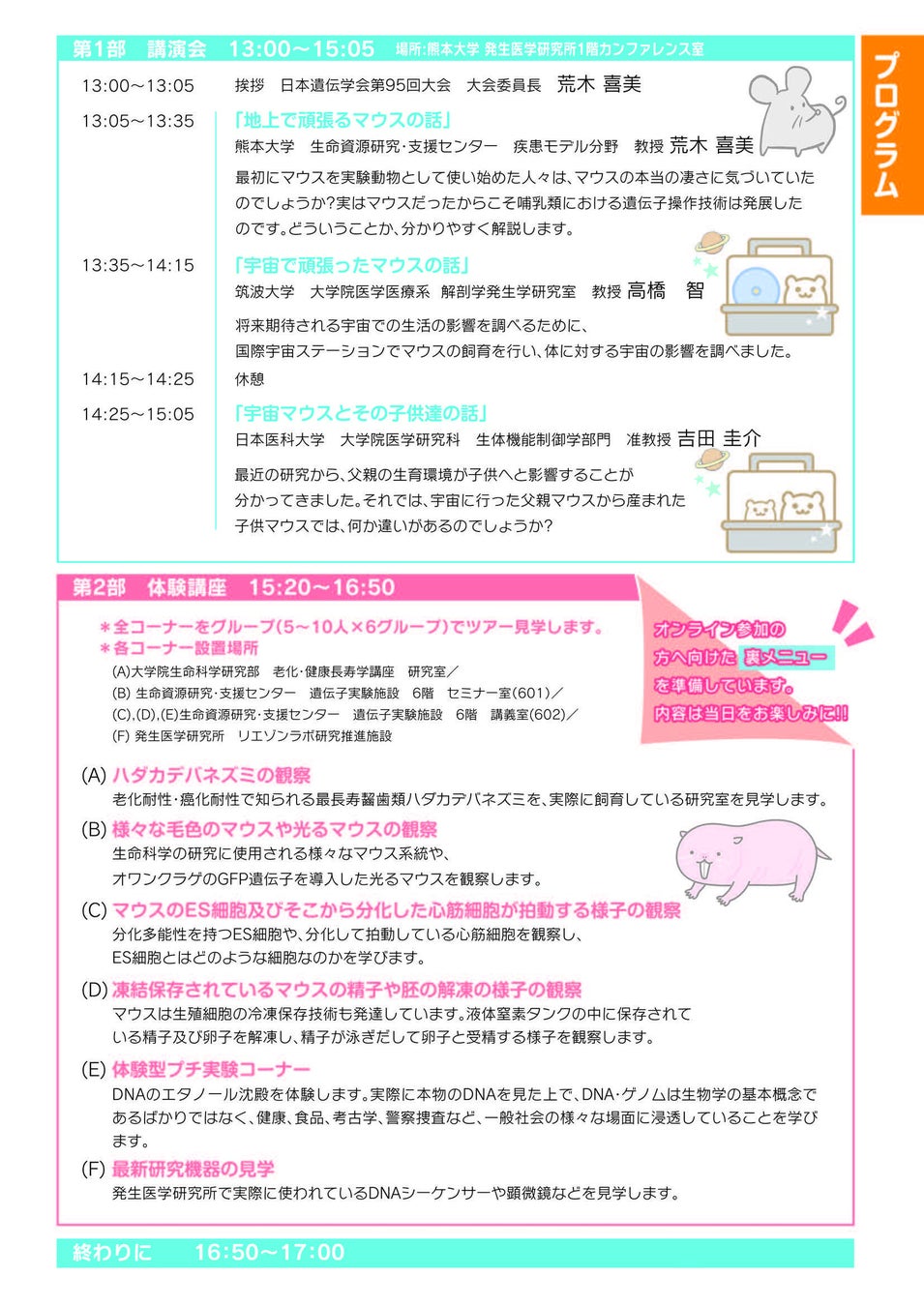 第1部は『宇宙環境と遺伝』というテーマで宇宙マウスを利用した研究を中心とした「講演会」を開催します。演題は3つで、「地上で頑張るマウスの話」「宇宙で頑張ったマウスの話」「宇宙マウスとその子供たちの話」です。宇宙環境が私たちにどのような影響を与えるのか、わかりやすくお話します。第2部では、大学内で研究に用いられているマウスの観察(クラゲの蛍光タンパクの遺伝子を持つ、光るマウスも観察していただく予定です!)、老化耐性・癌化耐性で知られるハダカデバネズミの観察、マウスの細胞(ES細胞、精子、卵子、受精卵)の観察、DNAを実際に肉眼で見る実験、生命科学の最新機器の見学を行う「体験講座」を開催する予定です。一般市民はもとより、中学生・高校生や教員の皆さんにも多数参加して頂きたいと思っております。
