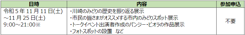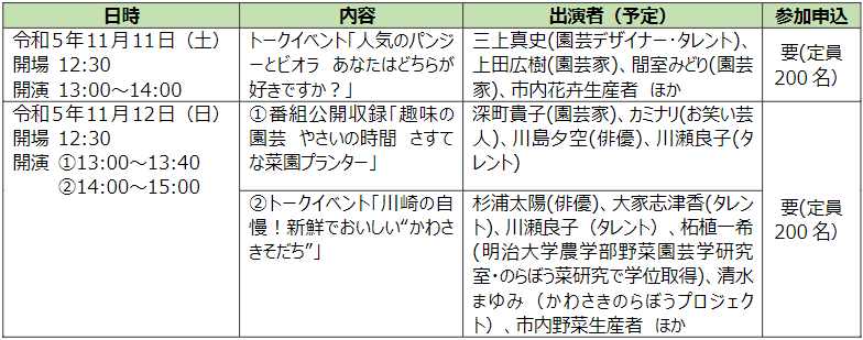 プレイベントでは、NHK横浜放送局と川崎市の共催による「趣味の園芸 やさいの時間」の番組公開収録や川崎市市制100周年記念事業・全国都市緑化かわさきフェア実行委員会主催によるトークイベントを行うほか、川崎のみどりの歴史の振り返りや、市民の皆さまがオススメする市内のみどりスポット等を紹介する展示を行います。