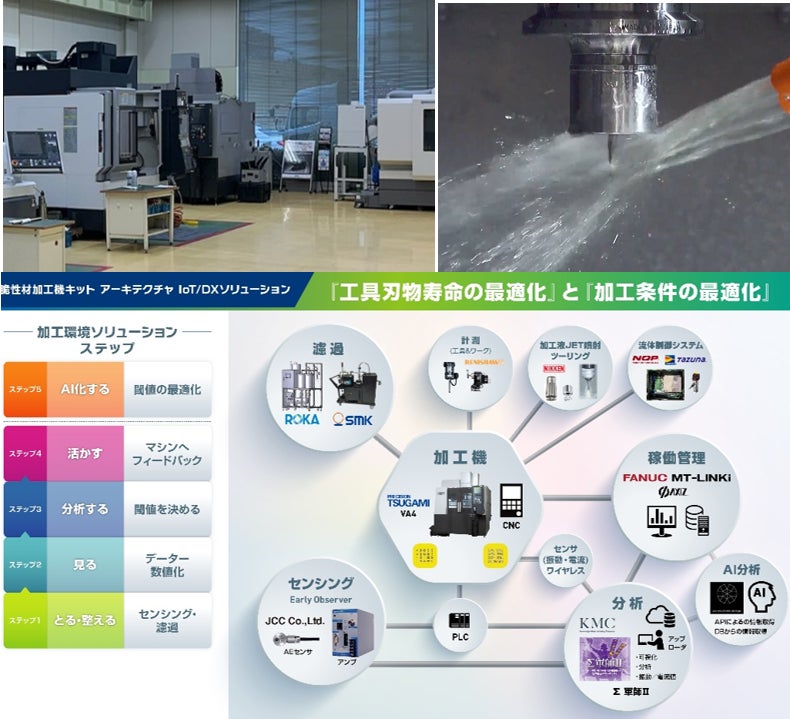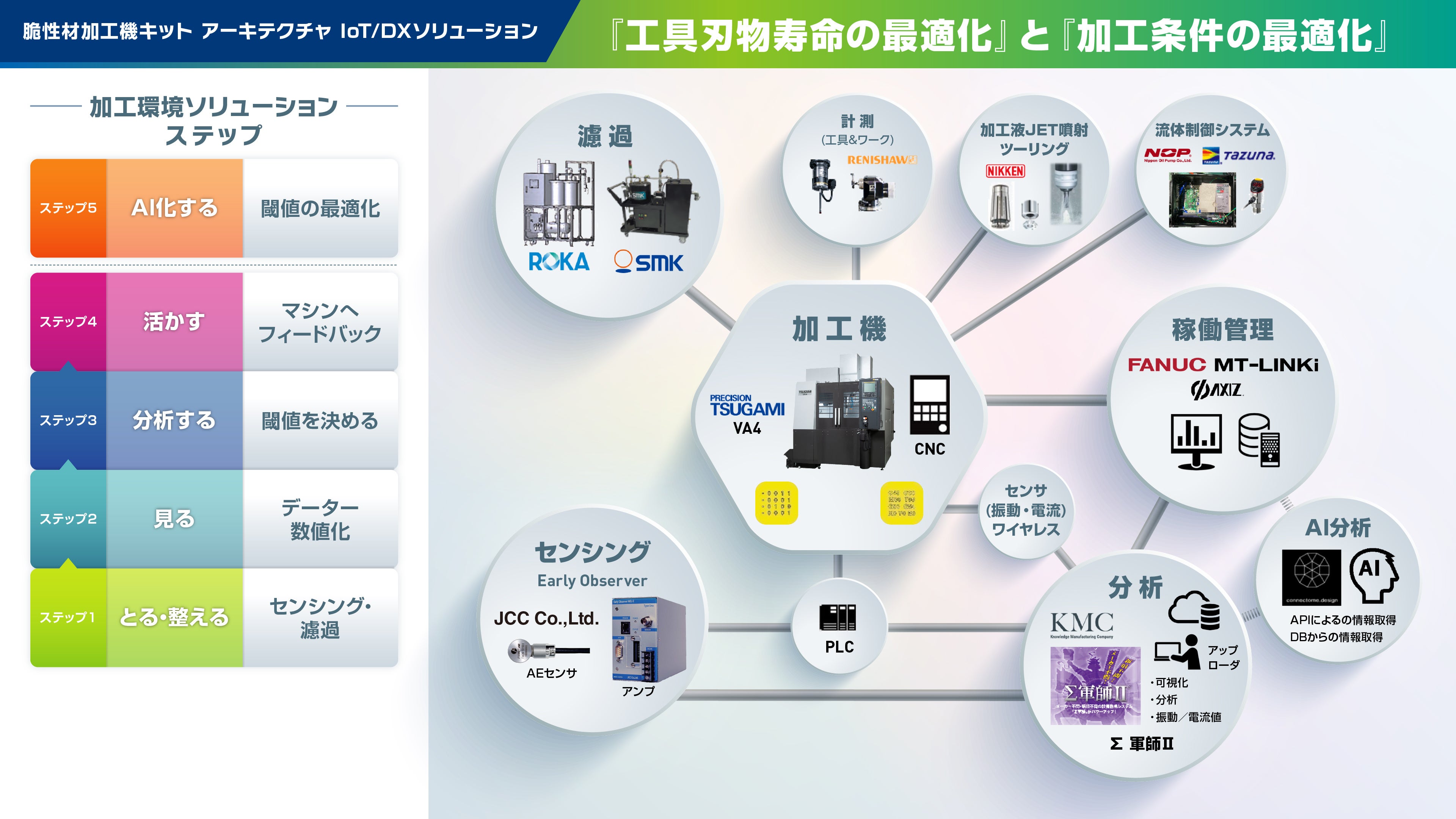 昨今の機械加工現場において、人手不足やDX化は喫緊の課題となっています。DX化に欠かせない自動化設備・センシングのための情報収集は、加工機内がクリーンな状態でなければ安定化しません。加工環境ソリューションは、スラッジ対策(精密濾過)により加工環境を整えることで、製造現場が抱える様々な問題を解決し、スマートファクトリー化を目指す製造業の皆様を応援します。ツガミ製立形マシニングセンタのVA4/VL4と、マイクロファインバブル発生機「バブパワー」による洗浄技術を核に、高精密ろ過装置、センシング技術を組み合わせ、加工効率の向上、設備・工具の長寿命化を追求しました。加工液に含まれる微小なスラッジを綺麗に除去することで、テスト時には工具の長寿命化を最大6.7倍まで引き上げることに成功しています。