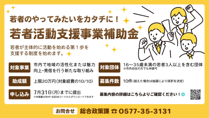 この制度は、16歳~35歳未満の若者3人以上を含む団体が、新たに行う地域の活性化または魅力向上・発信を支援するものです。助成額は上限20万円で、対象経費の10/10を補助するものです。