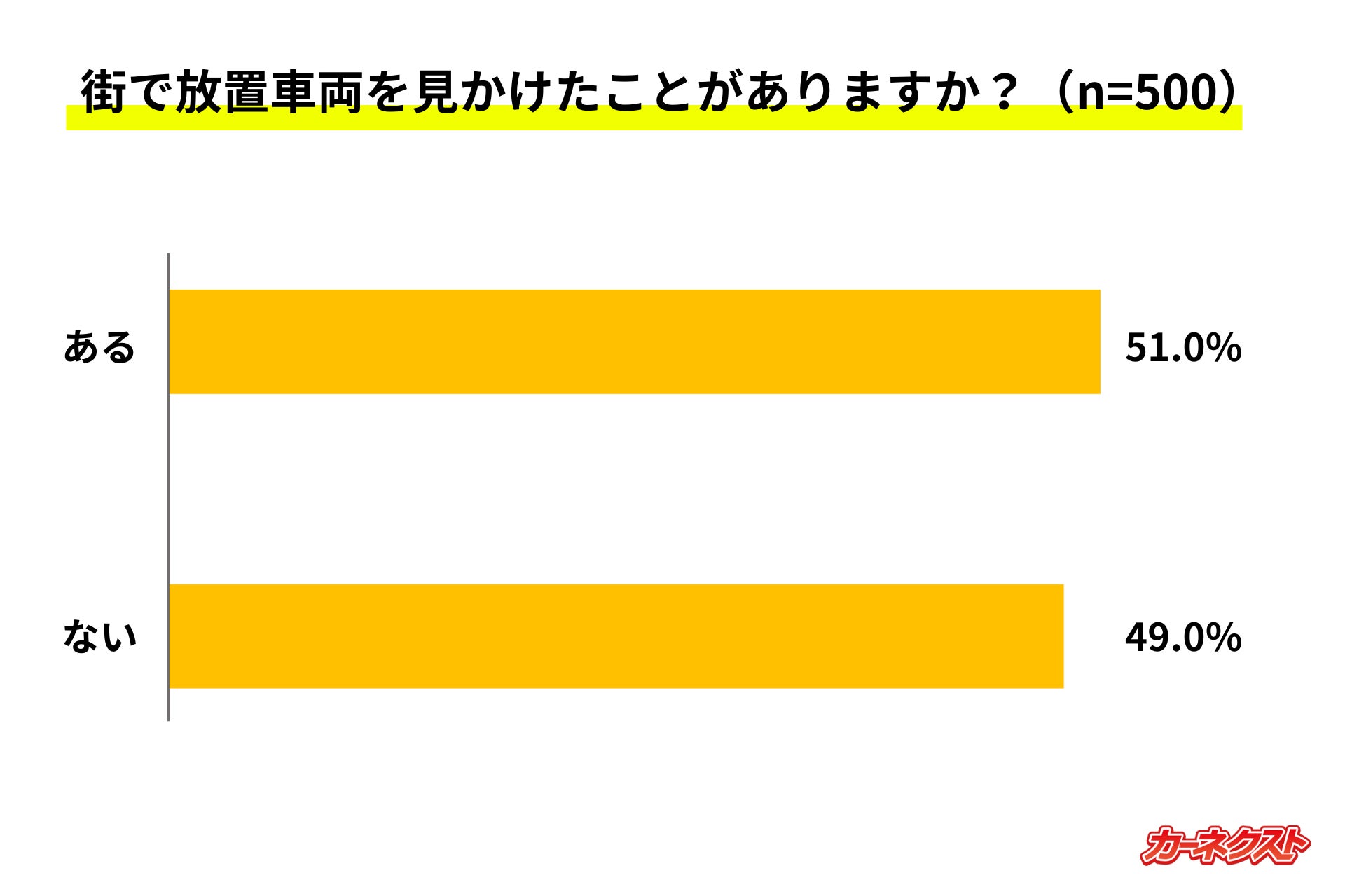 「街で放置自動車を見かけたことがありますか?」という質問に対して、「ある」と回答した割合は51.0%となりました。半数以上の人が、「放置自動車」を目撃していることがわかります。