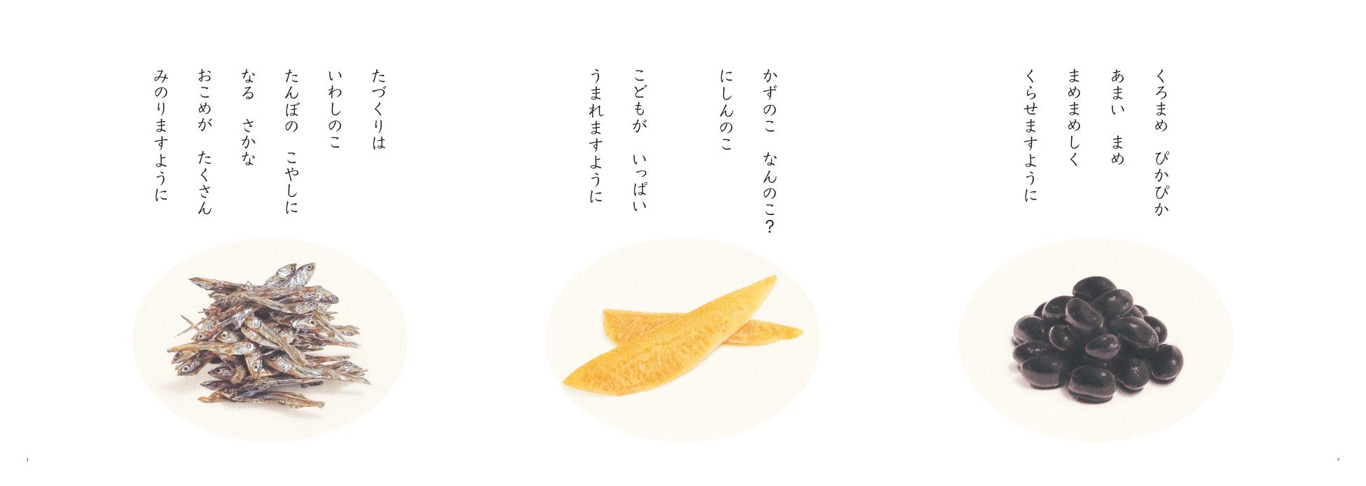 内容紹介:「くろまめ ぴかぴか あまい まめ。まめまめしく くらせますように」「きんとん きんかん きんいろ こがね。おかねが いっぱい たまりますように」など、おせち料理を美しい絵でひとつひとつ紹介しながら、そこに込められた願いをリズミカルなことばで伝える絵本です。時代も変わり、おせち料理もバラエティーに富んでいますが、今も昔も人々の願いは同じ。あらためて日本の伝統食・おせち料理の良さを味わえる一冊です。