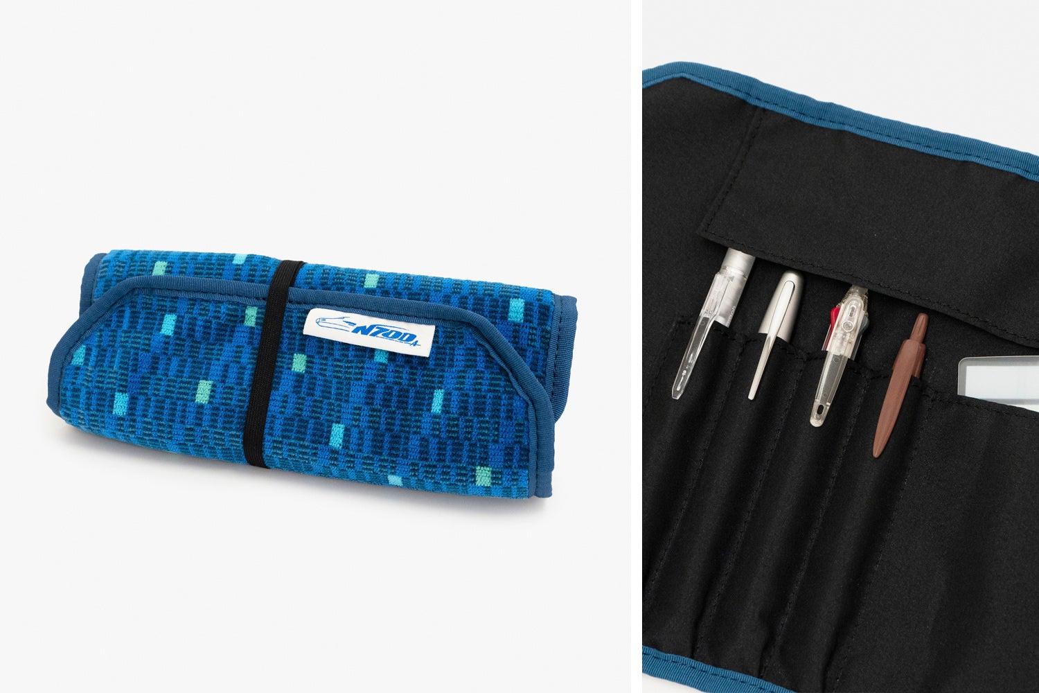 東海道新幹線N700系typeAの座席モケット生地を使用した、くるっと丸めて紐で留めるロール式ペンケース。