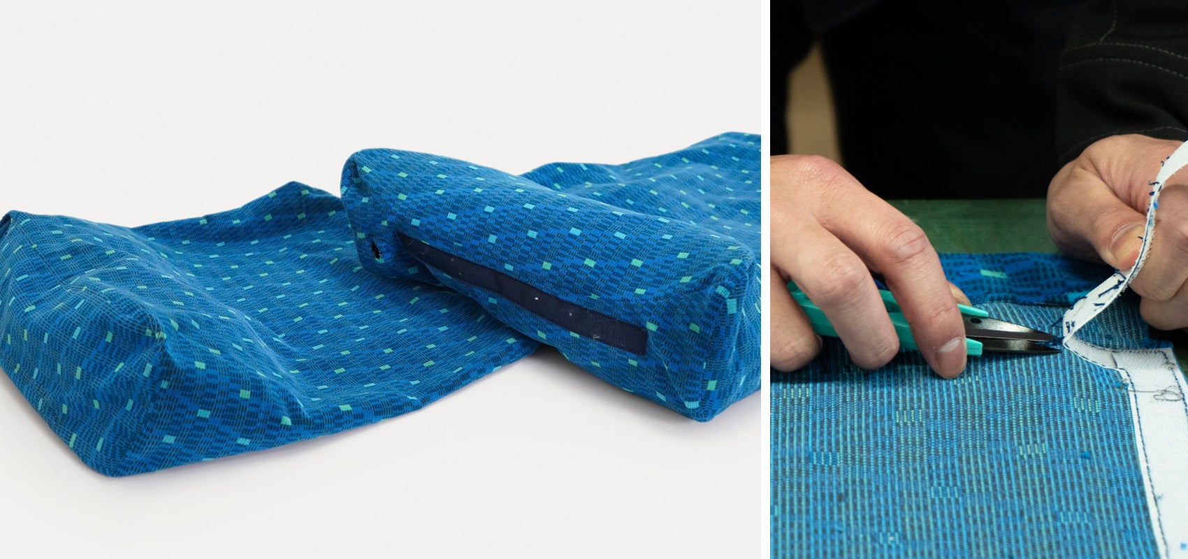 実際に東海道新幹線で使われていたモケット生地を採用。廃棄されるはずだった生地を洗浄後、再利用できる部分を選び、国内で丁寧に縫製しています。