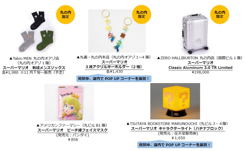 期間中、丸の内エリアでしか購入できない限定グッズを含めた、様々な「スーパーマリオ」のグッズが登場します。さらに、限定グッズを含む3,000円(税込)以上お買い上げのお客様に先着特典としてイベント限定デザインのステッカーをプレゼントします。