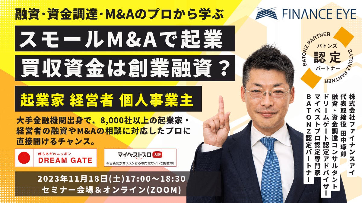 話題のスモールM&Aや事業承継で起業!買収資金はどうする?M&Aと創業融資で成功する方法。ファイナンスアイがセミナーで伝えます