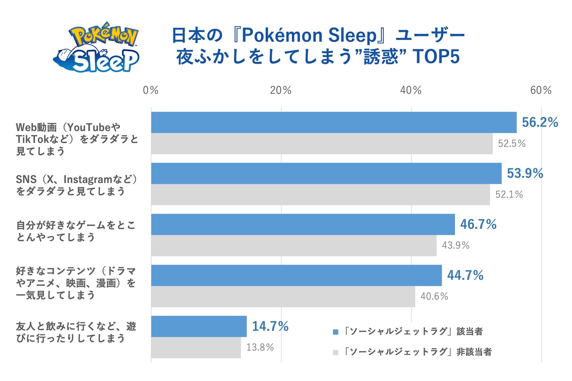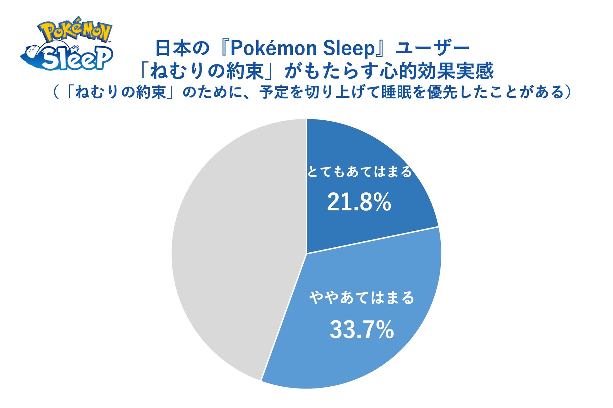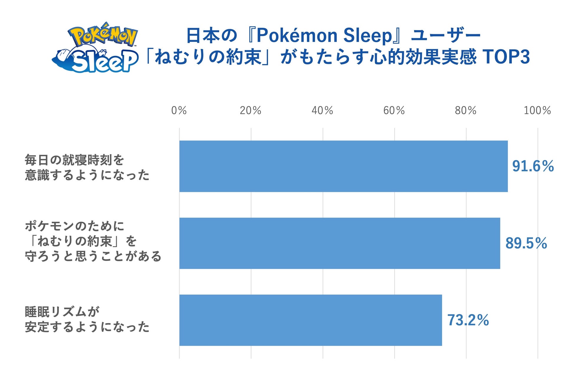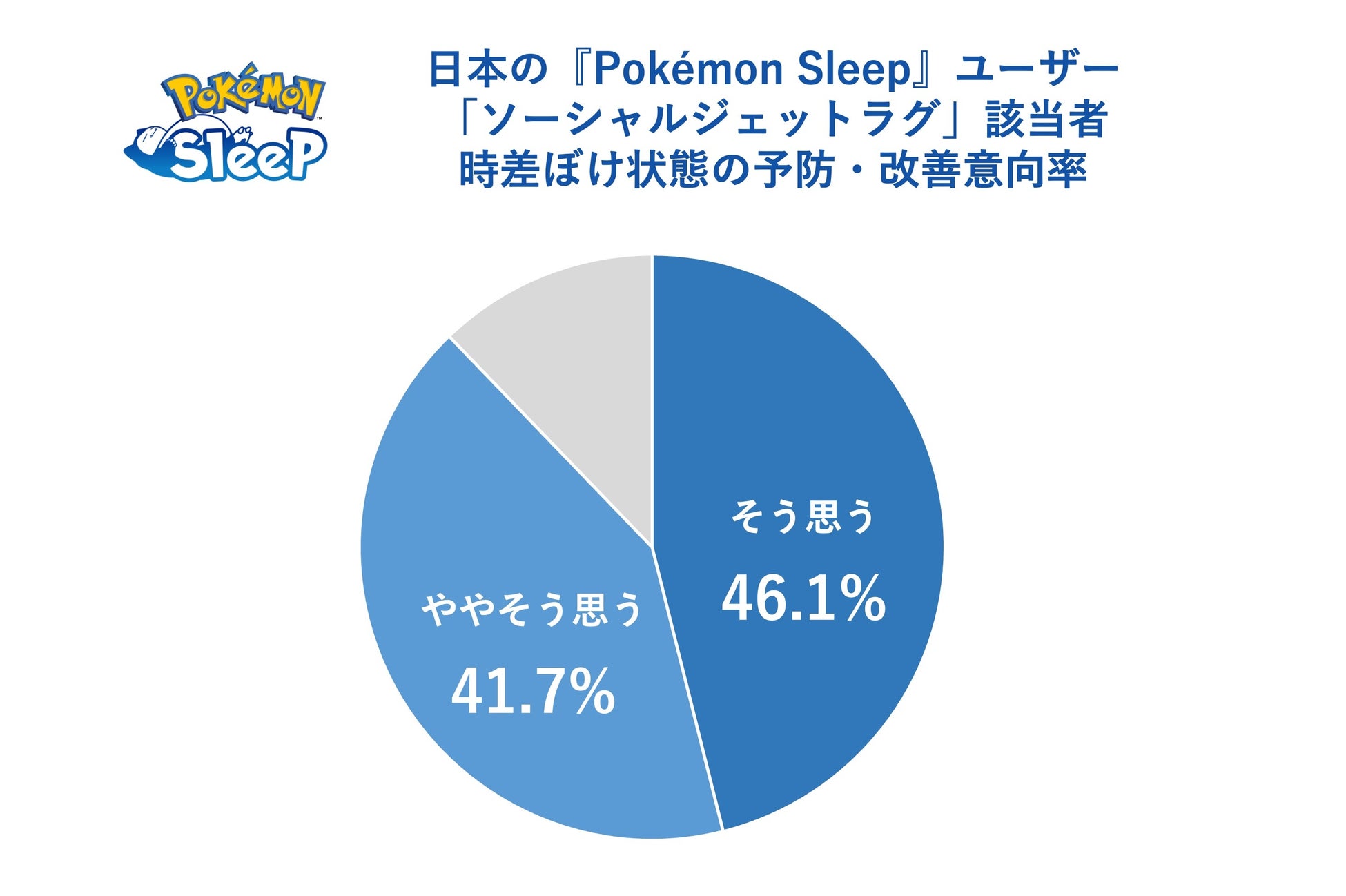 今回の調査結果で、日本のユーザーが諸外国ユーザーと比べ若干ソーシャルジェットラグ該当者が少なめだったのは興味深いです。『Pokémon Sleep』は1週間を単位に規則的な睡眠を取るほど総合評価が高くなるようにできていますので、日本人はそれを非常に真面目に実行しているのかもしれません。また、2人に1人が『Pokémon Sleep』の「ねむりの約束」で実際に行動を変えているということは、普段「色んなことをやりたい」「仕事が忙しい」「勉強も忙しい」「友人との時間も欲しい」、と睡眠を軽視しがちな日本人でも、睡眠に対する優先順位を上げることができていることを意味します。