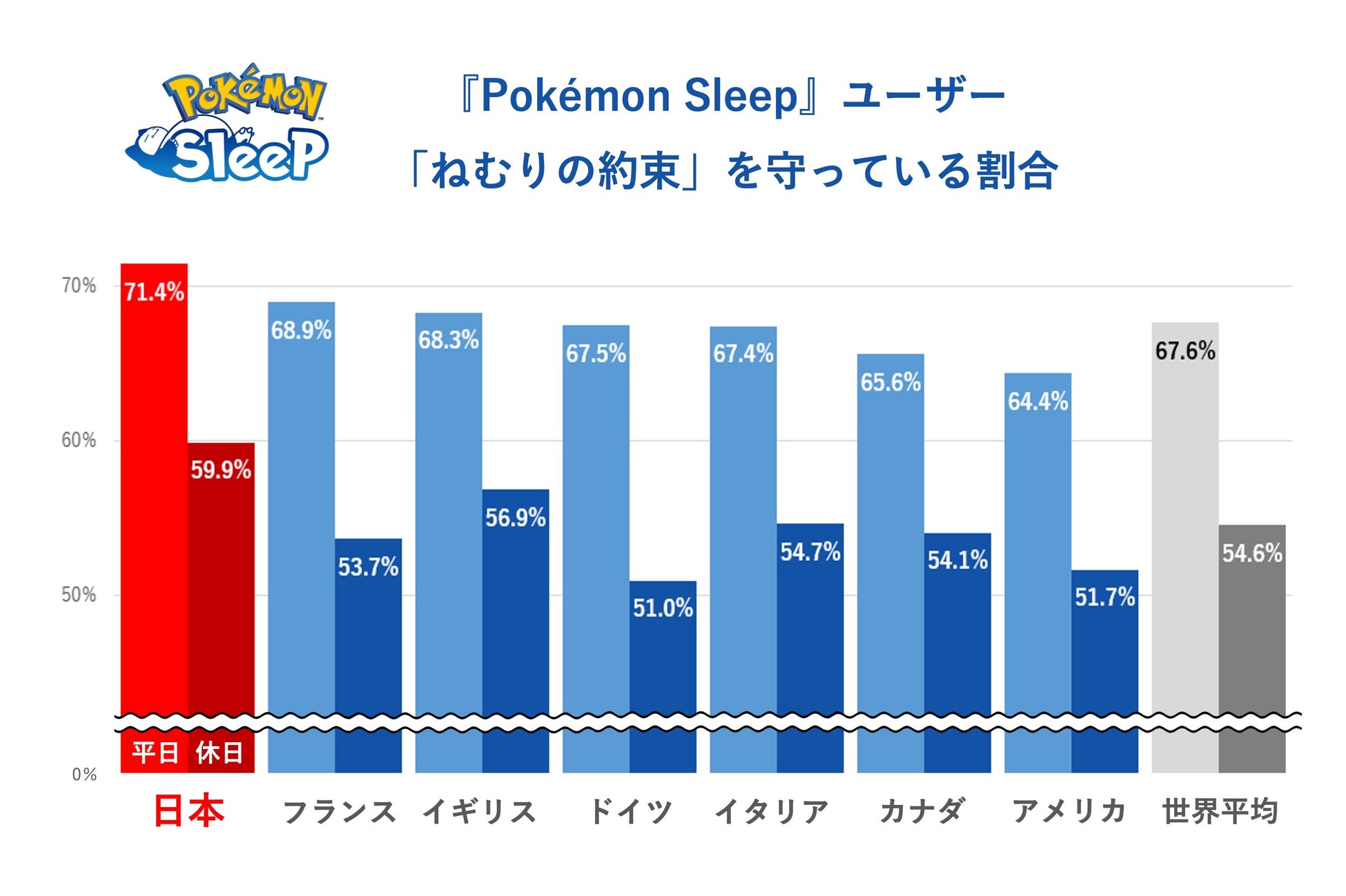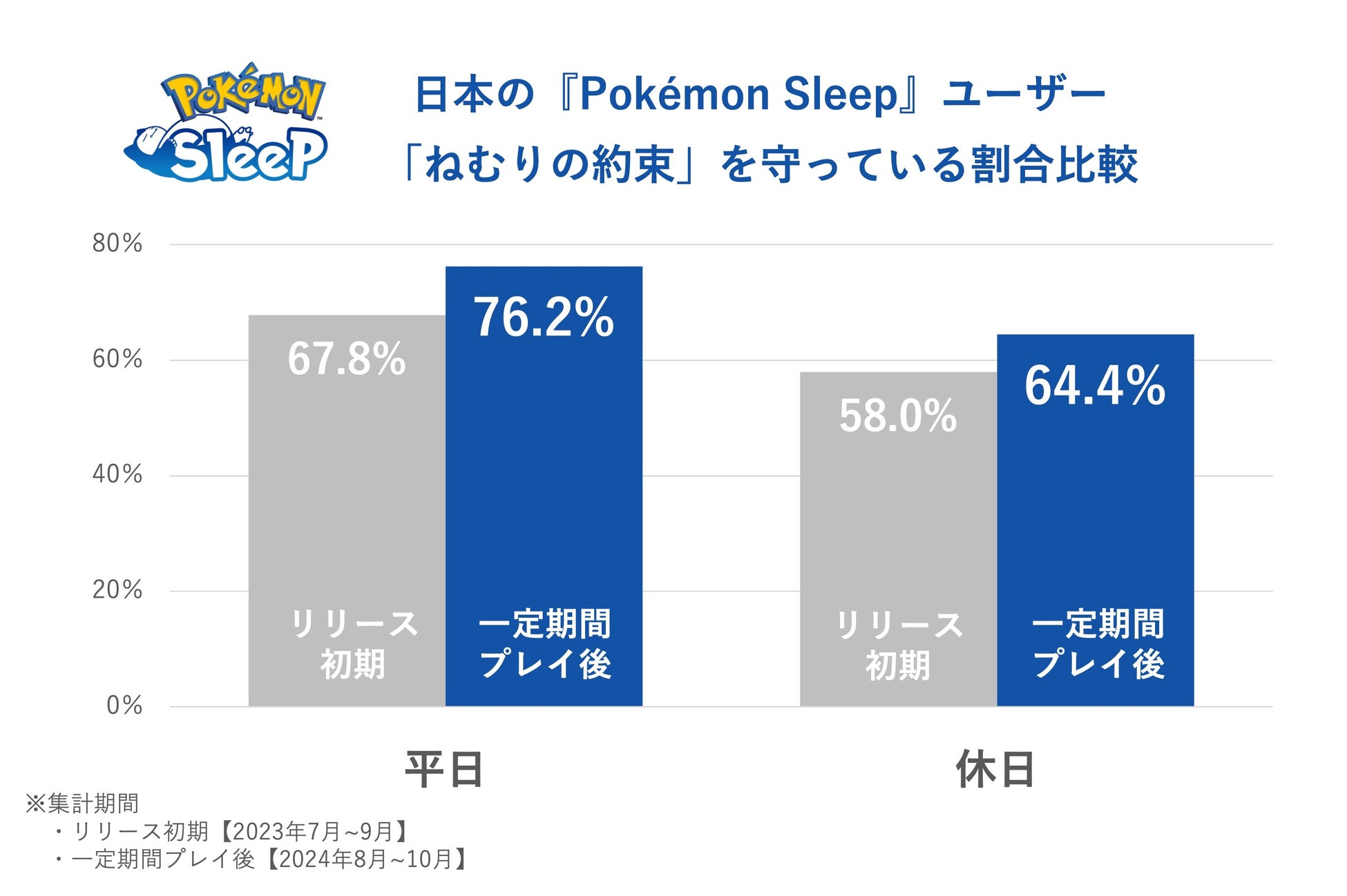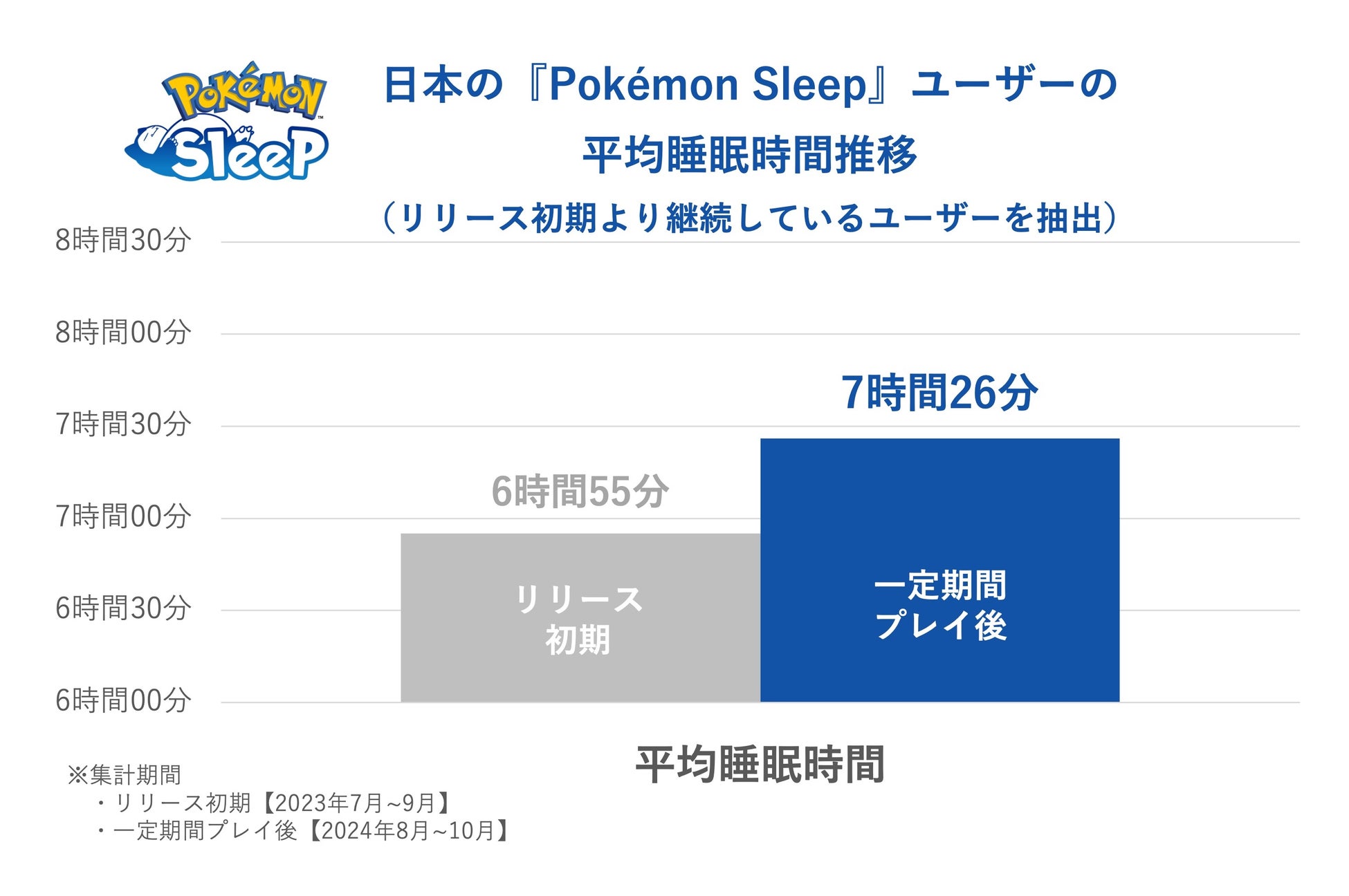 なお、『Pokémon Sleep』のリリース直後から現在までプレイしている日本人において、リリース直後3か月時点での平均睡眠時間は6時間55分であったのに対し、本調査の対象である直近3か月の平均睡眠時間は7時間26分であったことから、リリースからおよそ1年半で日本人の睡眠時間は約30分伸びていることもわかっています。