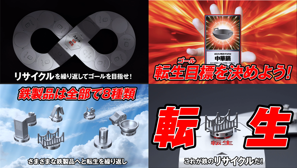 鉄の転生すごろくは、スチール缶が中華鍋、さらには吊り橋など、ゲーム内で次々と鉄製品に生まれ変わる様子を通じて、身近にある鉄が何にでも何度でも全量リサイクルされていること、鉄の優れたリサイクル性・環境優位性を体感出来ます。