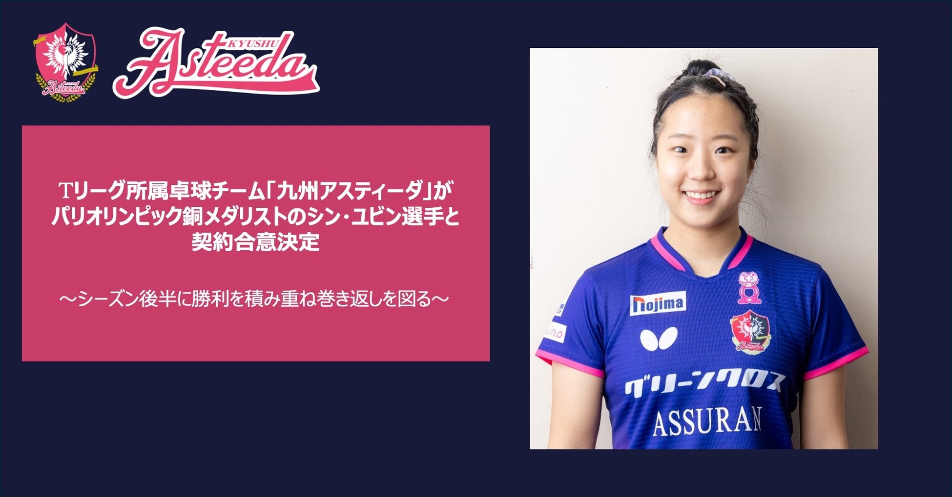 Tリーグ所属プロ卓球チーム「九州アスティーダ」を運営する「九州アスティーダ株式会社」(所在地:福岡県大野城市、代表取締役 川面 創 以下、当チームおよび、当社)は、卓球リーグ「Tリーグ」の2024-2025シーズンにおいて、シン・ユビン選手とTリーグ参戦に関する契約を行ったことをお知らせします。