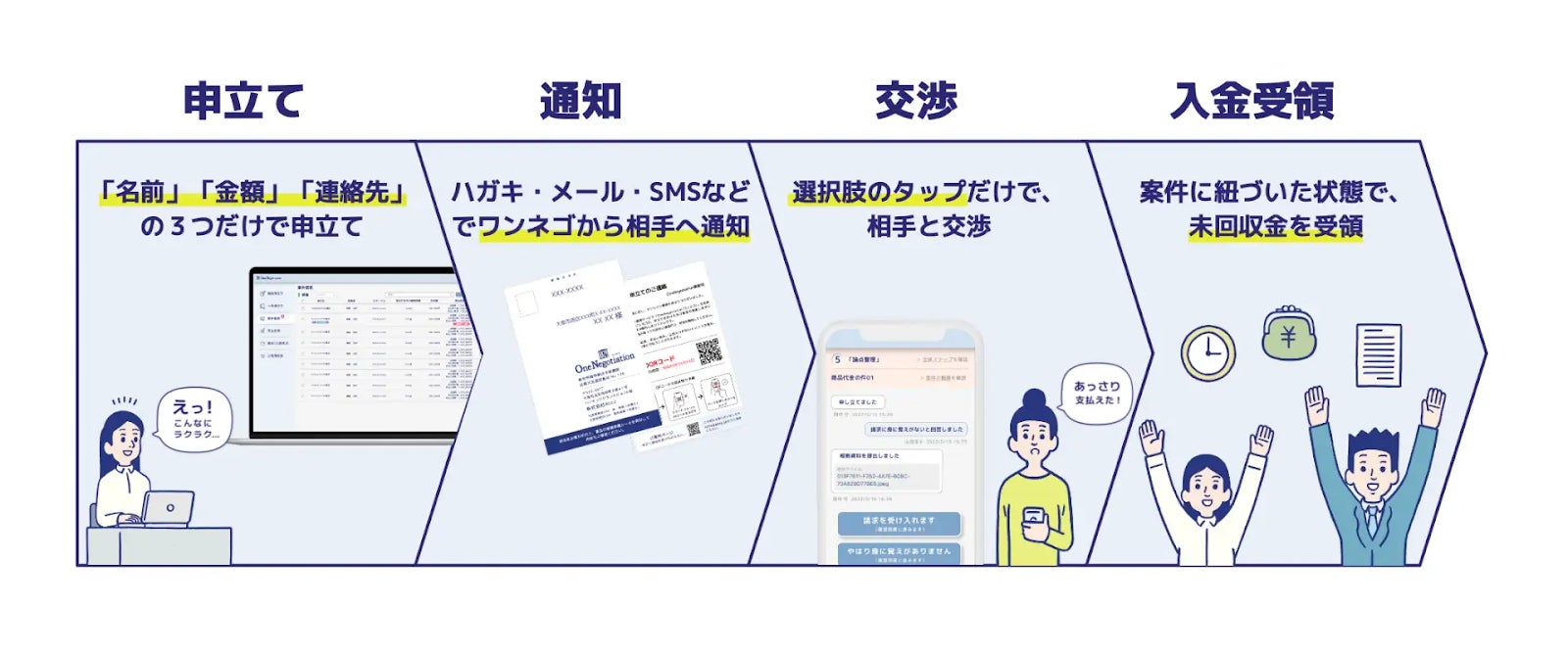 株式会社AtoJは、BtoBにおける少額債権の未回収課題に対し、オンライン上で合意形成を可能にする対話型ODRプラットフォーム「OneNegotiation(ワンネゴ)」を提供しています。 テクノロジーとデザインをコミュニケーションに溶け込ませることで、高圧的な督促ではなく、「スムーズな対話」による解決を実現。これまで回収が困難だった未収金の解消や、支払い忘れによる滞留を防ぎ、誰もがストレスなく支払いを行える社会を目指しています。
