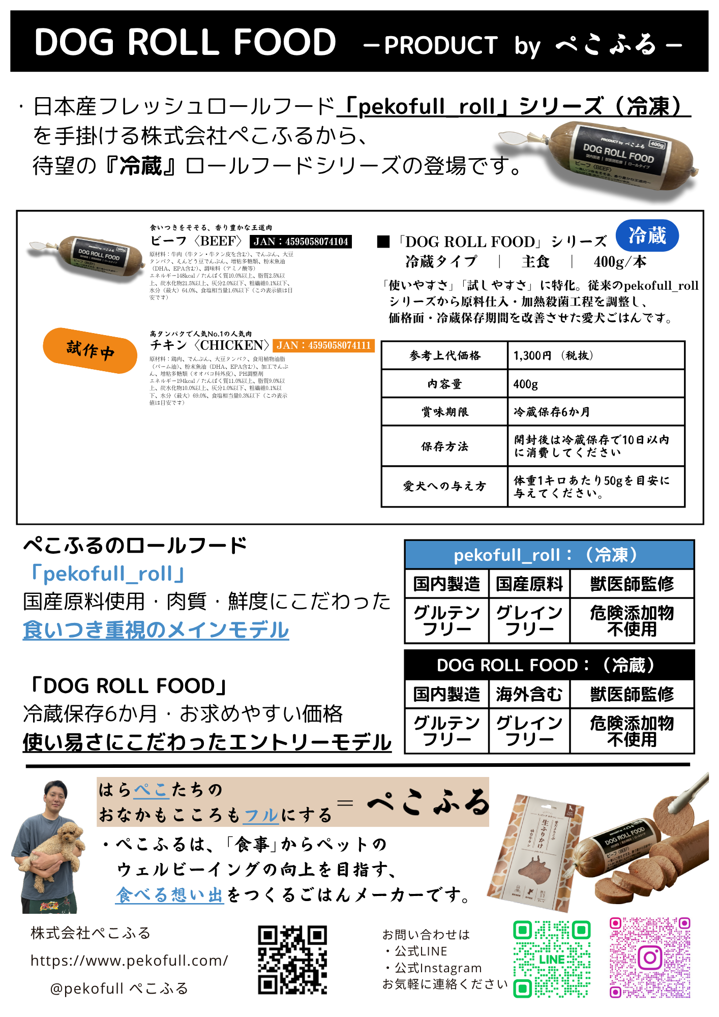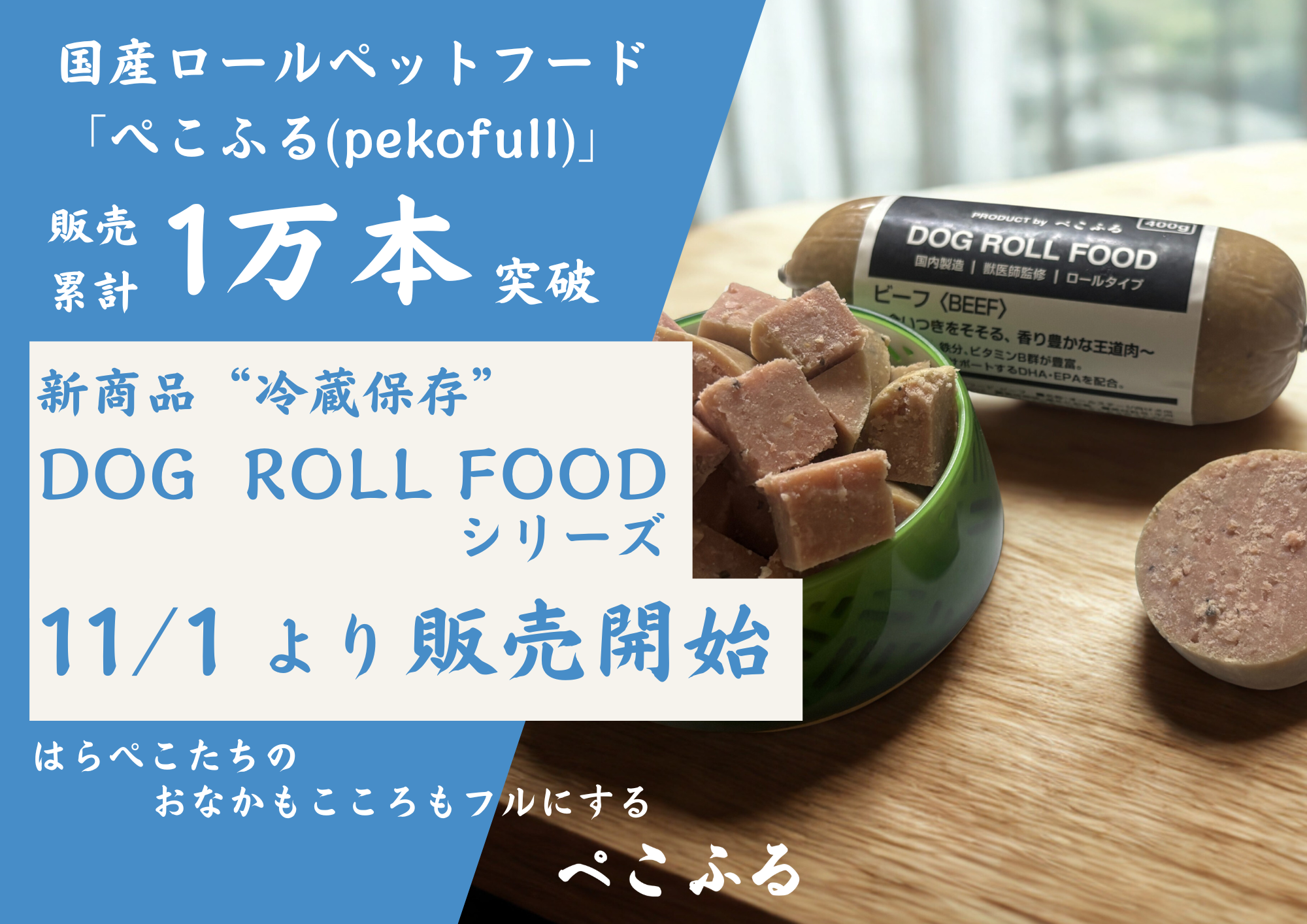 pekofull_rollシリーズの販売累計10,000本突破に伴い、ぺこふるブランドの新シリーズとなる “冷蔵” ロールフード「DOG ROLL FOOD」の提供を開始します。