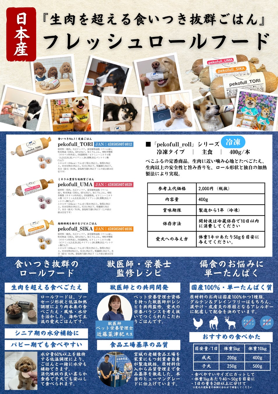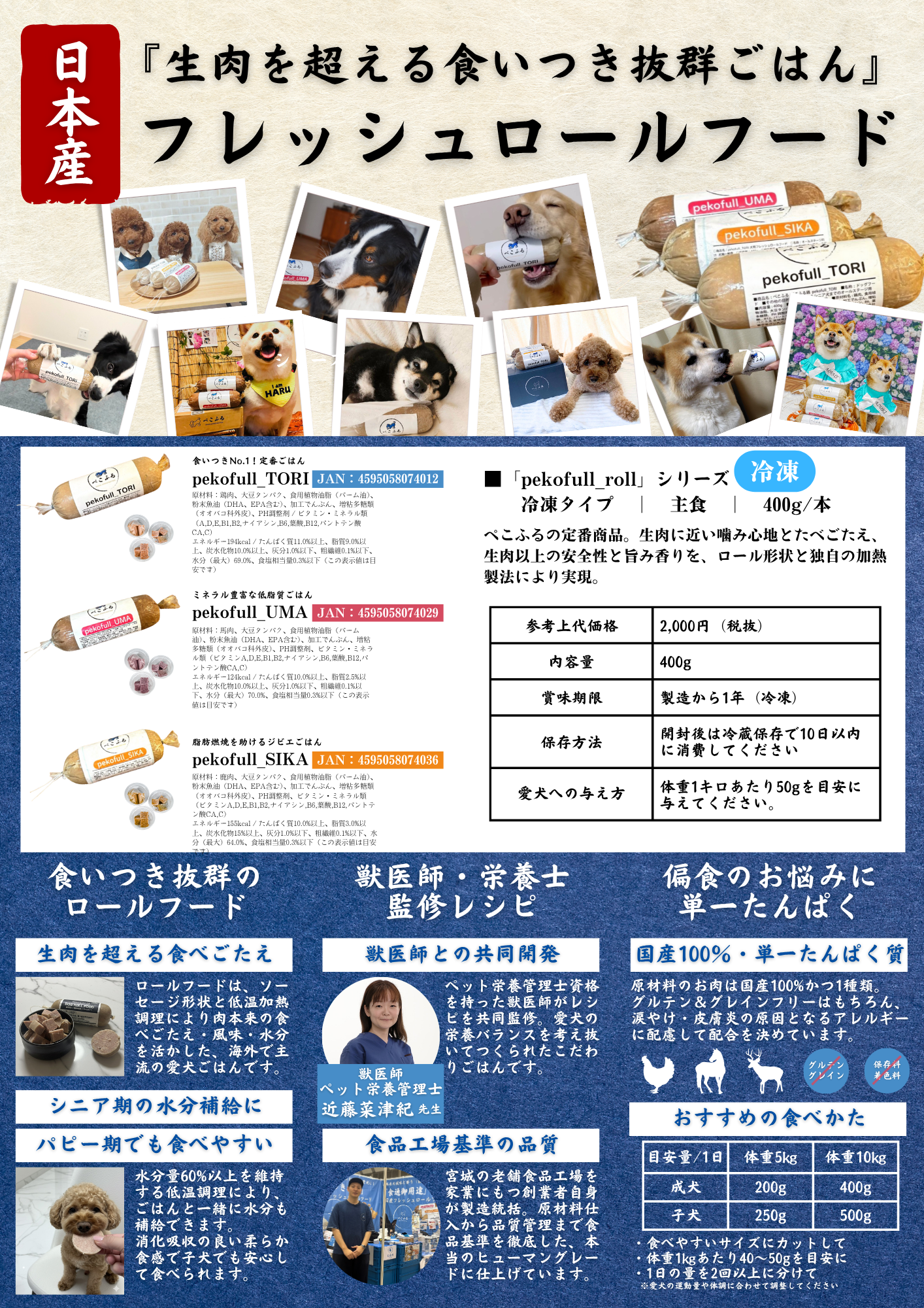 により食いつきの良さに定評のあるペットフードで、「国内製造」「国産原料」の日本産ロールフードとして完成したのがpekofull_rollです。