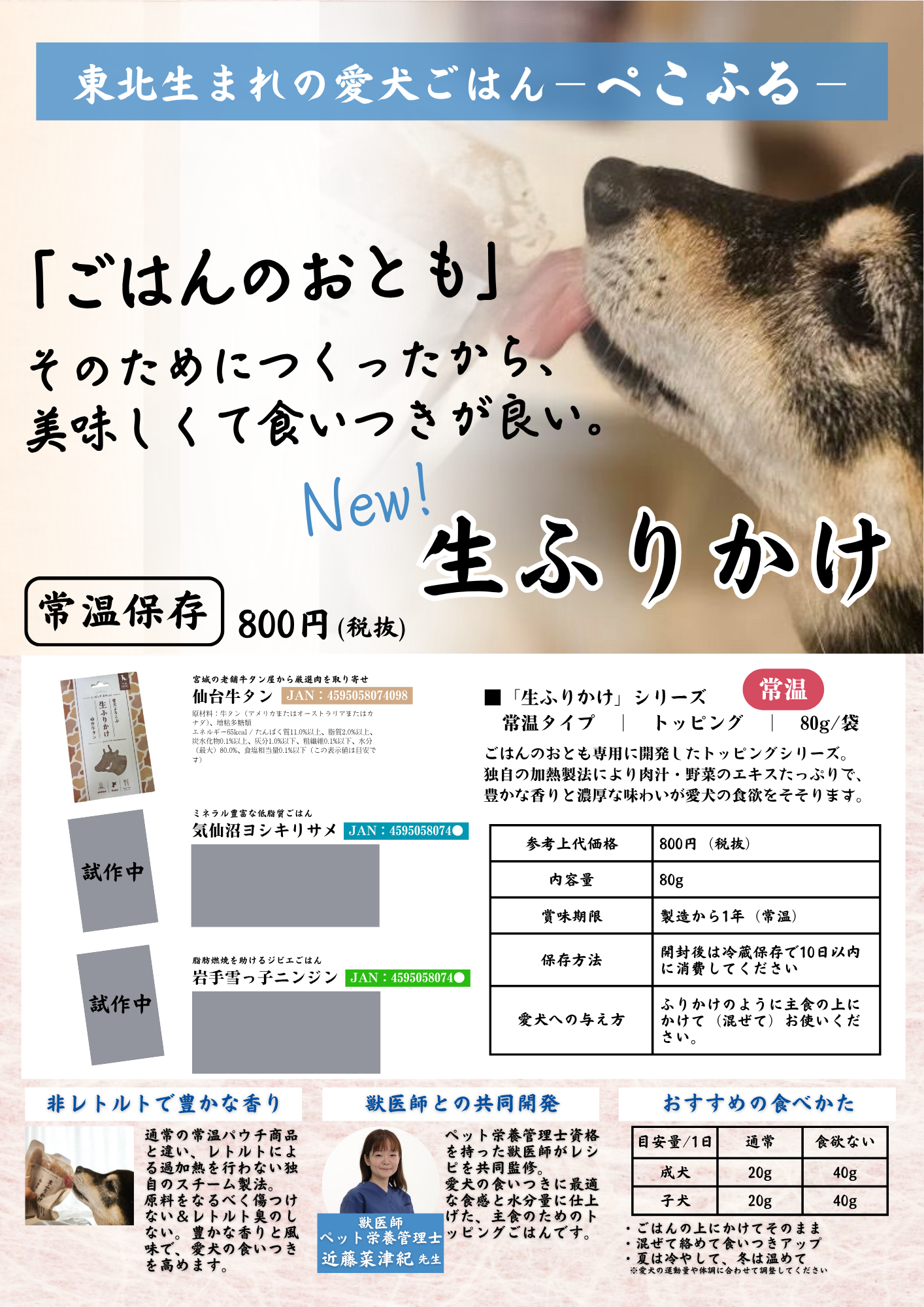 現在は、愛犬の主食ごはんとして「pekofull_roll」「DOG ROLL FOOD」シリーズ、トッピングごはんの「生ふりかけ」シリーズ、などの開発と販売を行っており、自社オンラインショップの運営のほか、卸売による取り扱い店舗の拡充、各種ペットイベント出店による試食販売の実施など、愛犬とその家族の「食べる想い出」づくりの場を提供しています。
