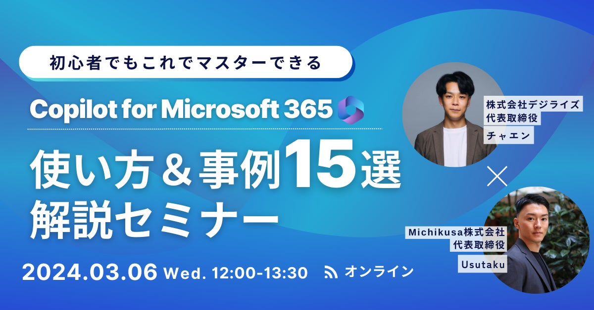 2024年3月、株式会社デジライズ代表取締役・茶圓将裕氏とMichikusa株式会社代表取締役・臼井拓水氏が登壇する「ゼロから始める!Copilot for Microsoft 365使い方&事例15選解説セミナー」を開催します。