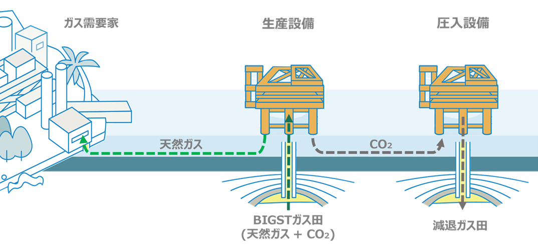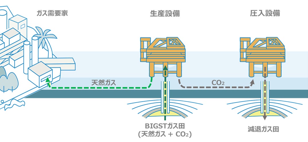 BIGST は豊富な天然ガス埋蔵量(約 4 兆標準立方フィート)を有することが確認されておりましたが、ガスと共に高濃度の CO₂を含むことから、これまで開発が見送られてきた経緯があります。BIGST の開発に際しては、天然ガスとともに産出される CO₂を 分離・回収して近隣の減退ガス田に圧入することで、チャリガリとともに BIGST の新規開発の実現を目指す、いわば従来型の天然ガス開発と環境対応型事業である CCS を組み合わせた、低炭素の石油・天然ガス開発事業のモデルケースと言えるものです。当社は、すでに商業化している米国テキサス州における Petra Nova CCUS<注 2>プロジェクトで培った知見などを総動員し、天然ガス需要が増加するマレーシア国内へのガス供給増に貢献するとともに、本プロジェクトをひとつのマイルストーンとして、国内外での