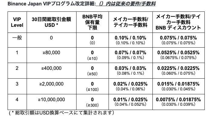 今回のプログラム改定では、これまでVIPレベル昇格の要件としていたBNB平均保有量の下限が免除されるほか、メイカー/テイカー手数料が引き下げとなります。