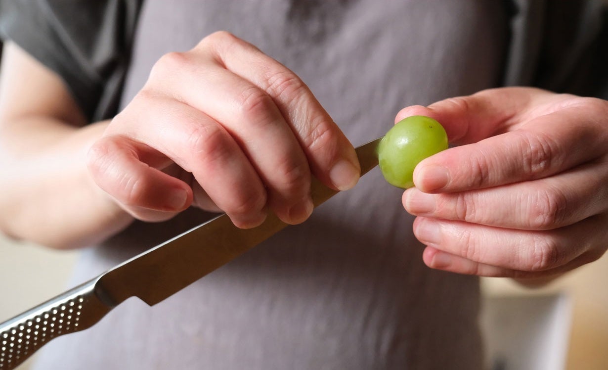 熟練職人が一本ずつ手作業で本刃付けを行い、果汁や香りを逃さず美しい断面を実現しました。