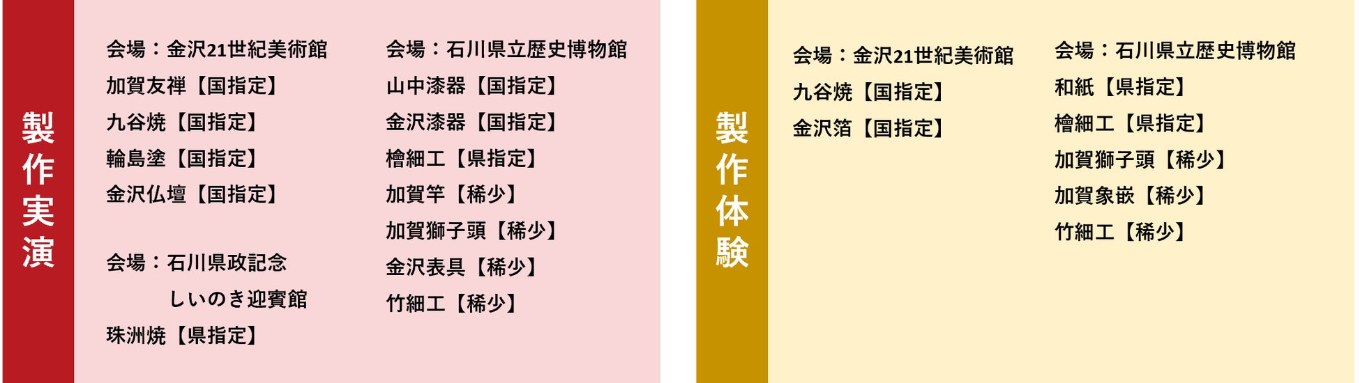 全国の伝統的工芸品の製作実演や製作体験を通じて、職人の技を体感することができます。プログラムの実施場所については下記をご確認ください。 ※石川県の工芸品を抜粋