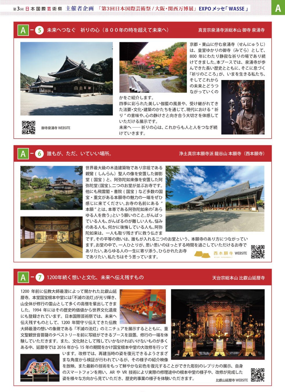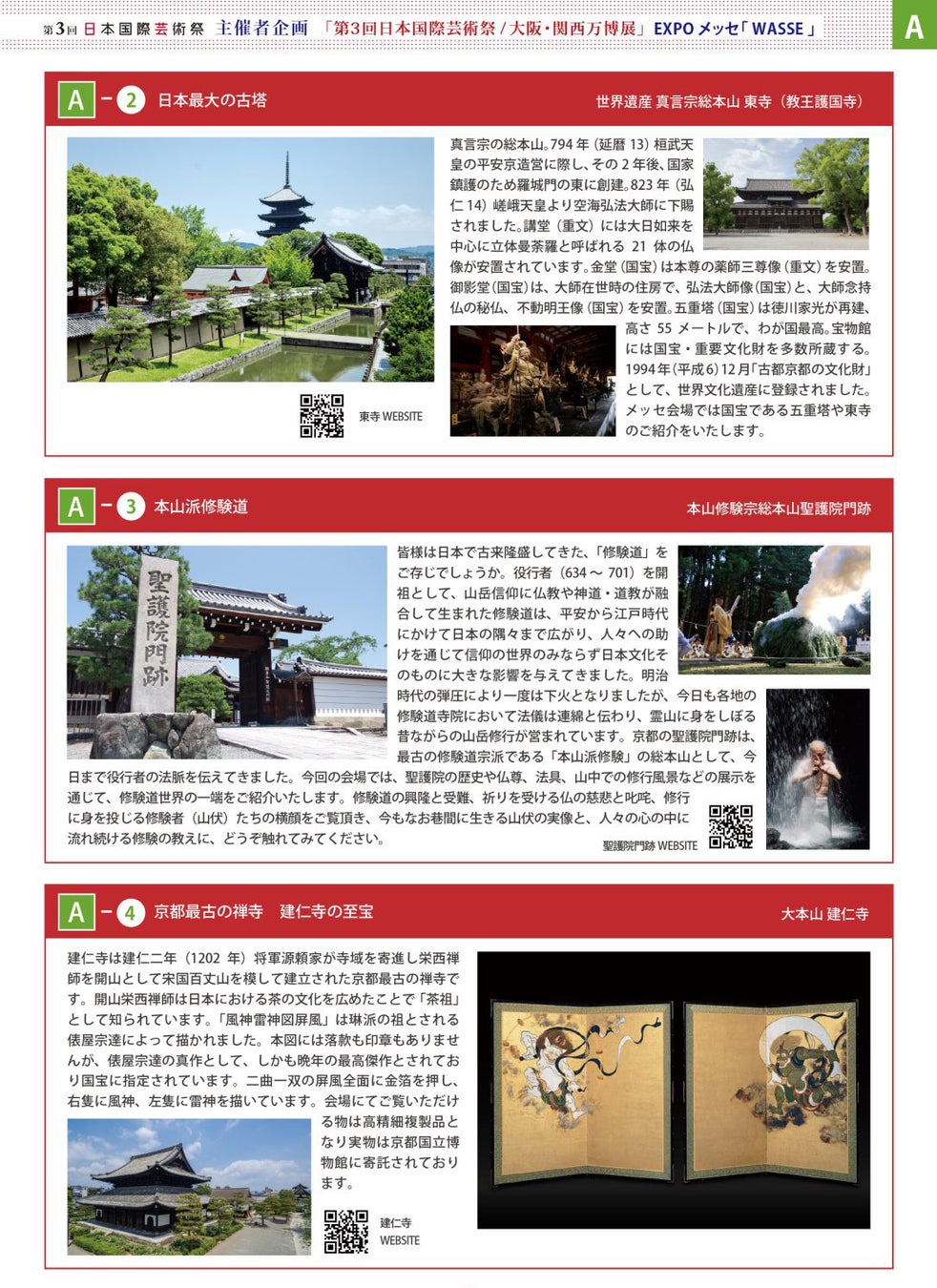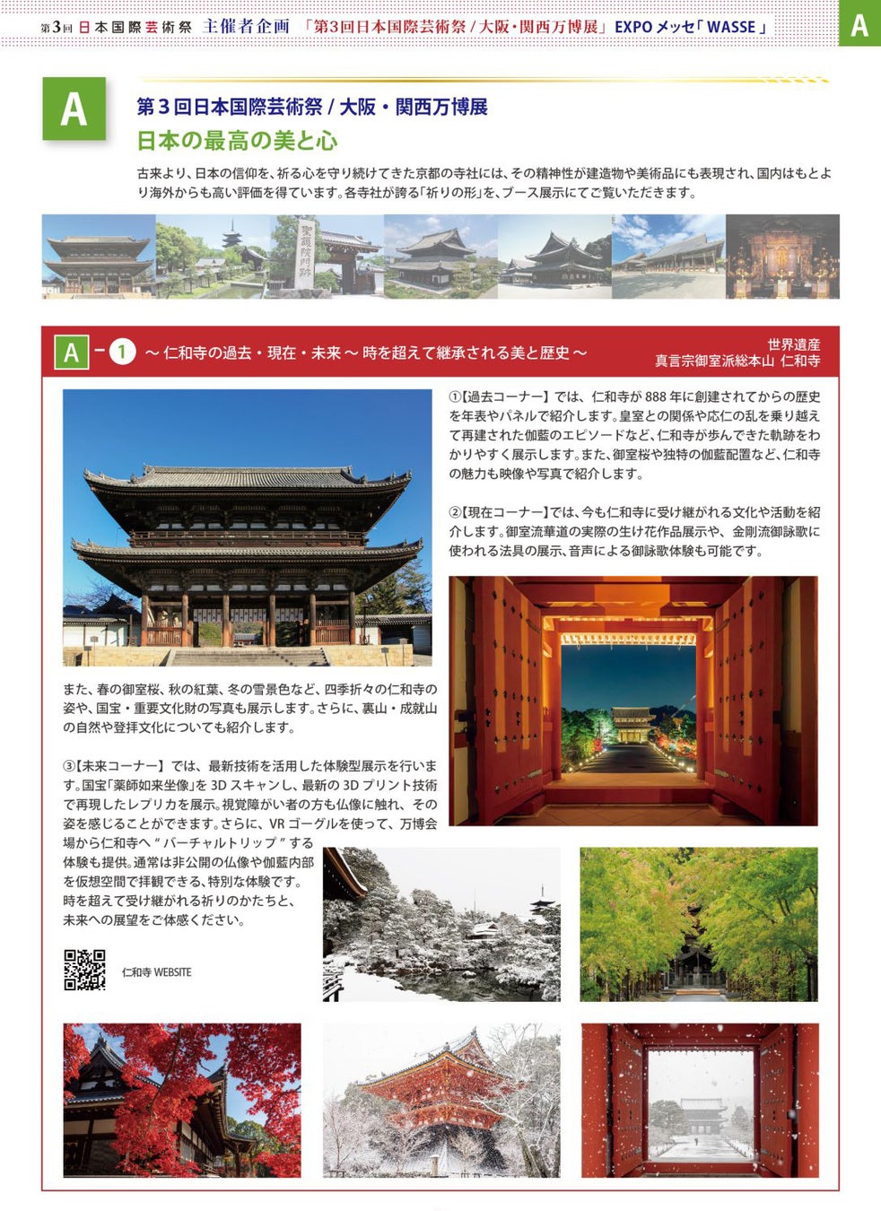 「日本の最高の美とこころ」Aゾーンには、仁和寺、東寺、聖護院門跡、建仁寺、御寺泉涌寺、西本願寺、比叡山延暦寺が特別出展下さいます。